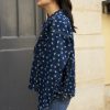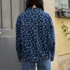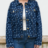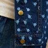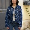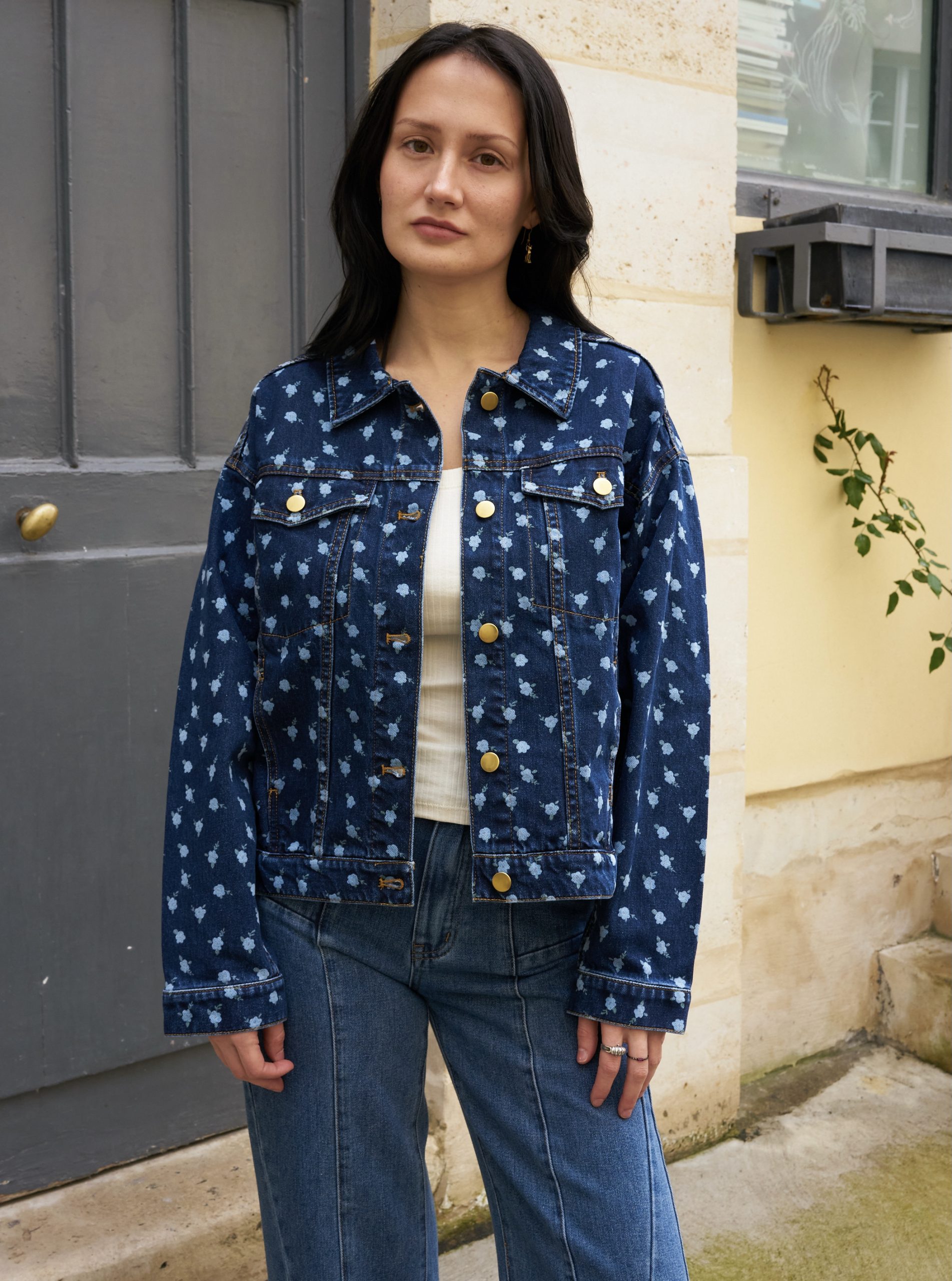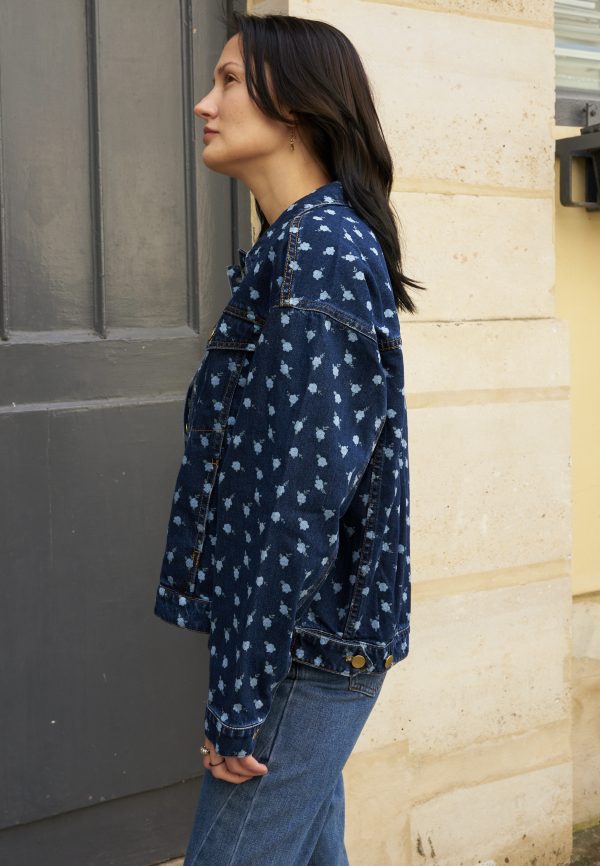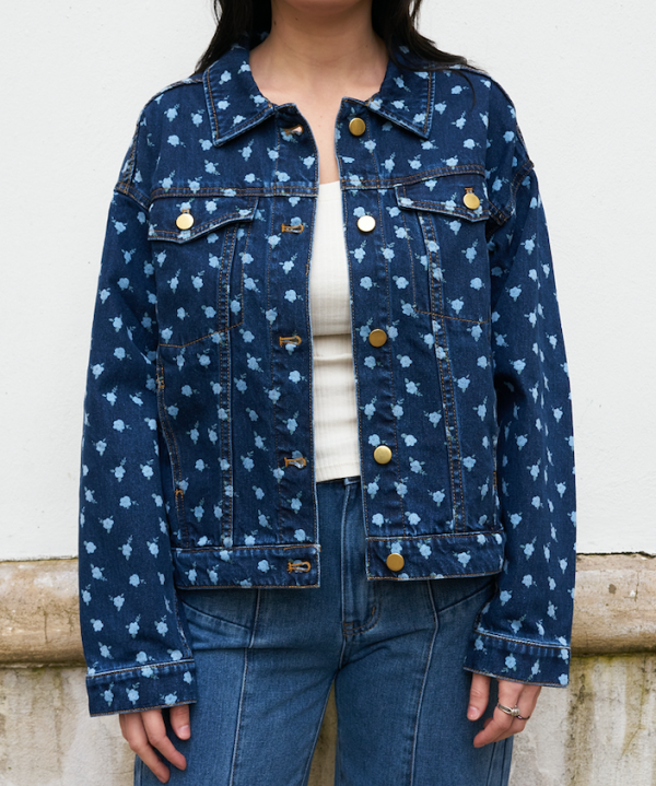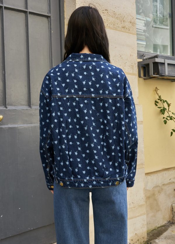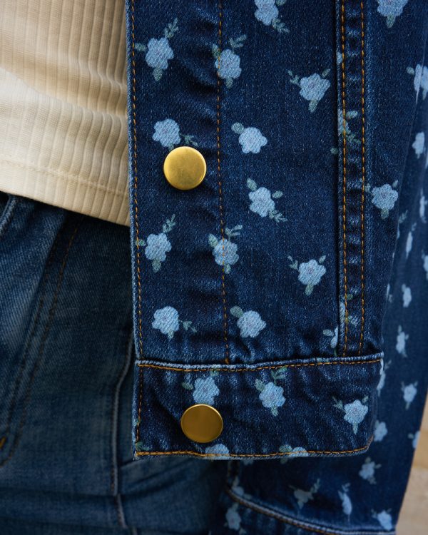 Oversized flower print denim jacket with gold metallic buttons