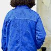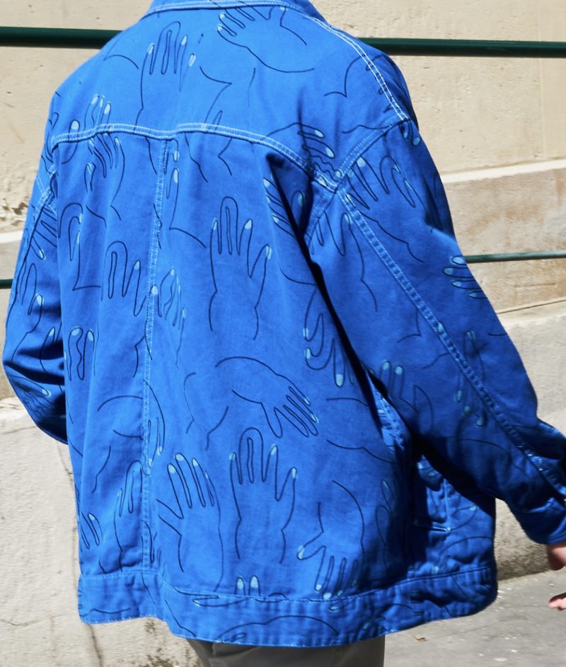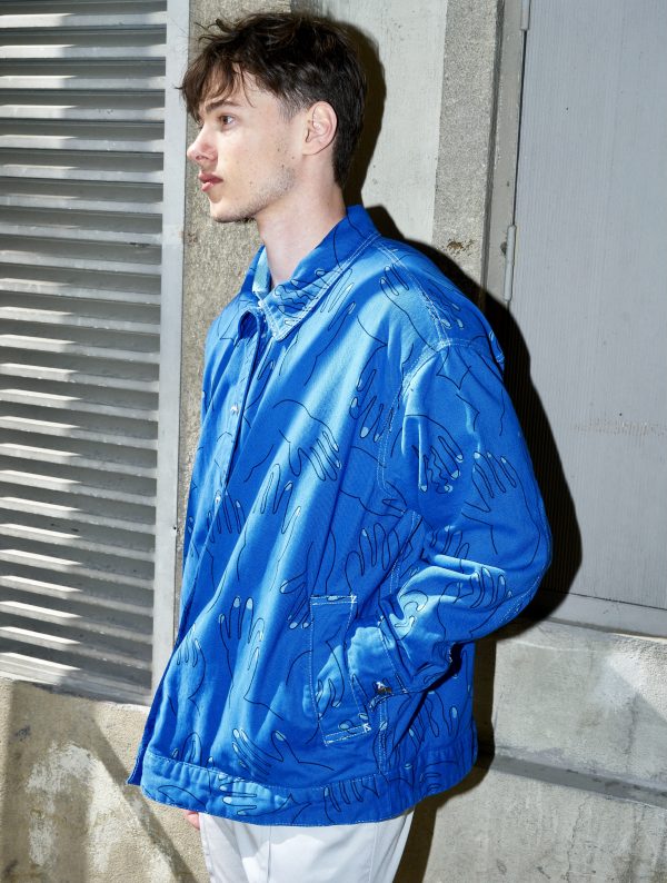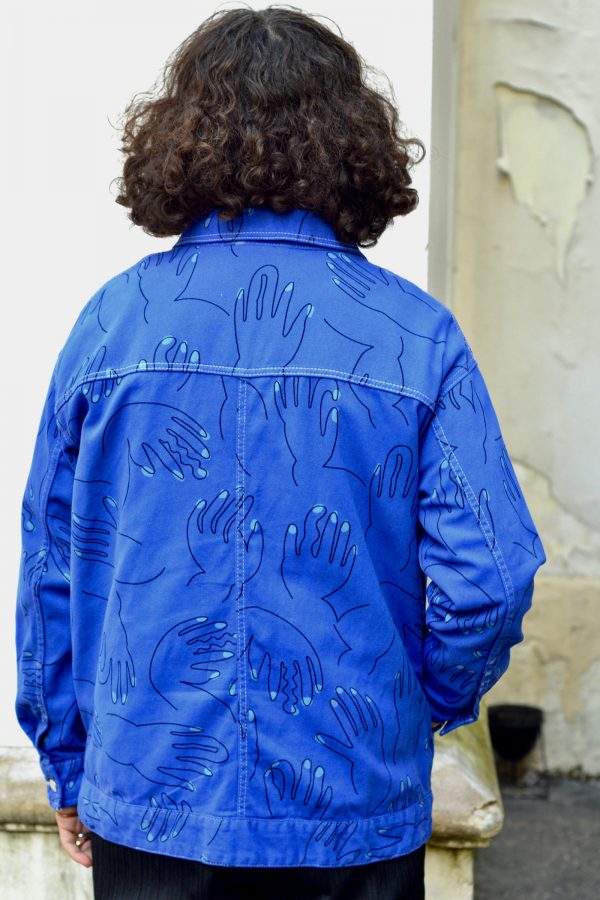 Up-cycled Oversized Work Jacket in cotton twill canvas printed with an all over pattern of hands. The Jacket is equipped with inside and outside pockets.