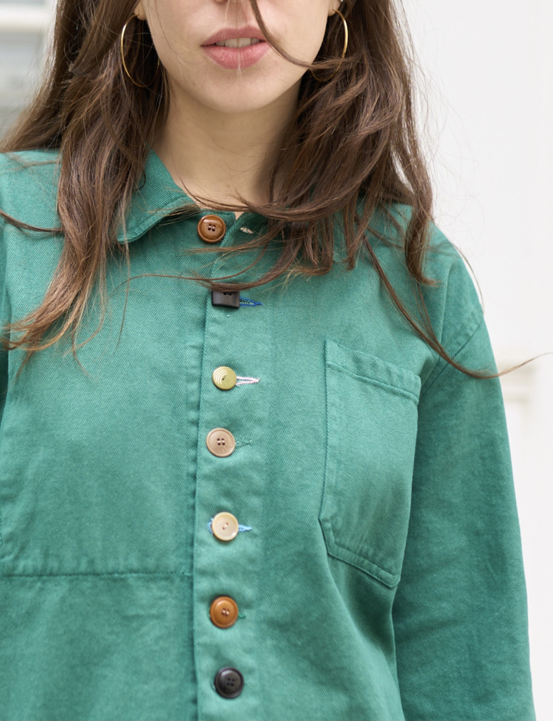 A modern reinterpretation of a timeless Parisian staple. Crafted from soft washed cotton for a relaxed yet structured fit, this jacket is detailed with carefully selected mismatched vintage buttons — each one telling its own story. Functional, understated, and full of quiet character, it brings a playful twist to classic workwear while evoking the effortless charm of Parisian style.