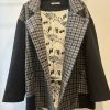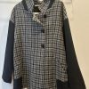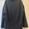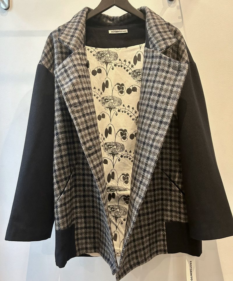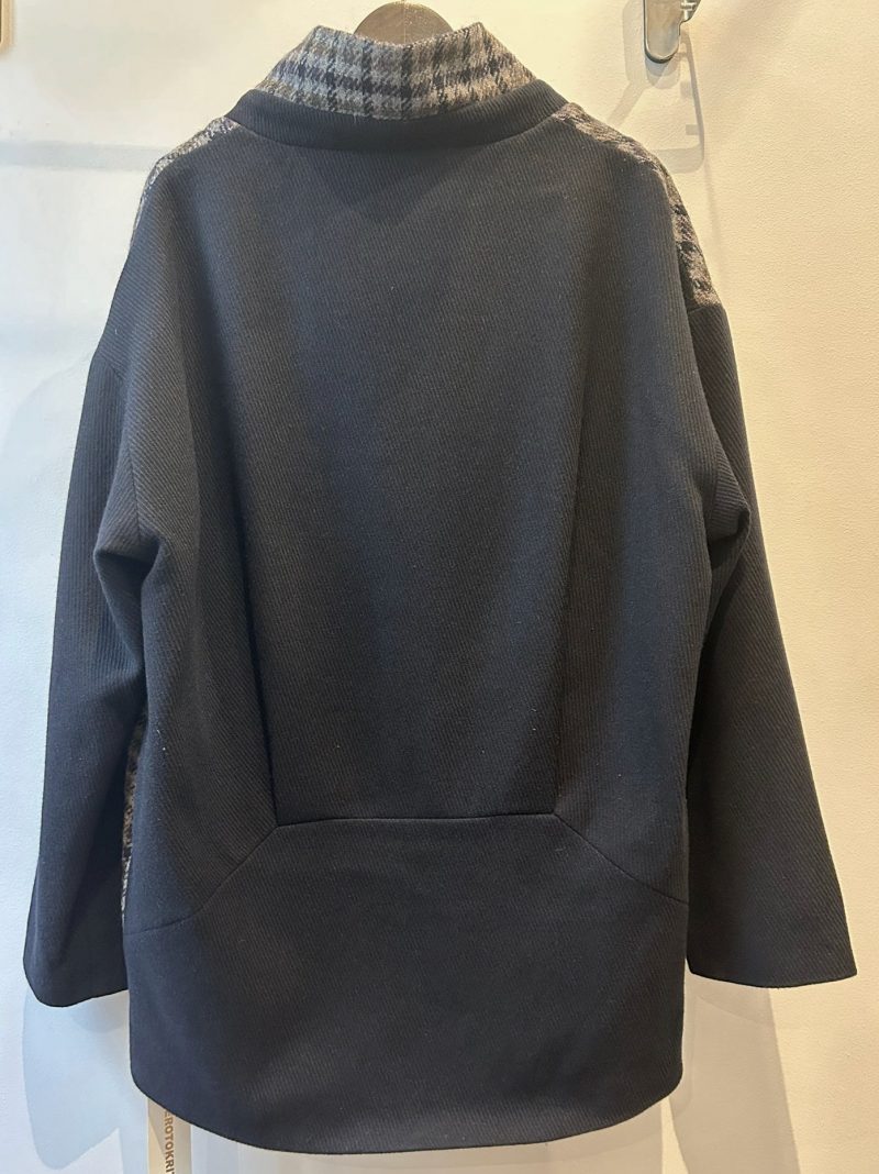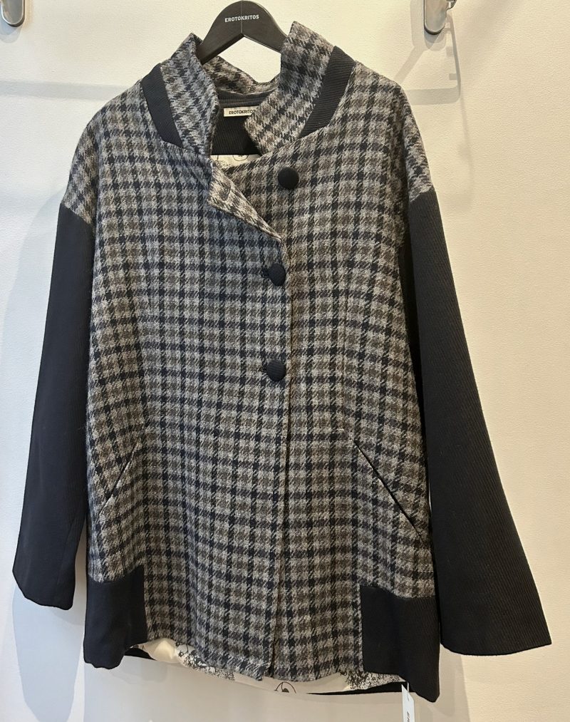 Material block short coat with drop shoulder and high collar, lit has large pockets and big buttons.