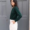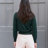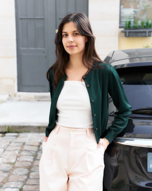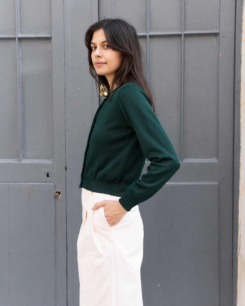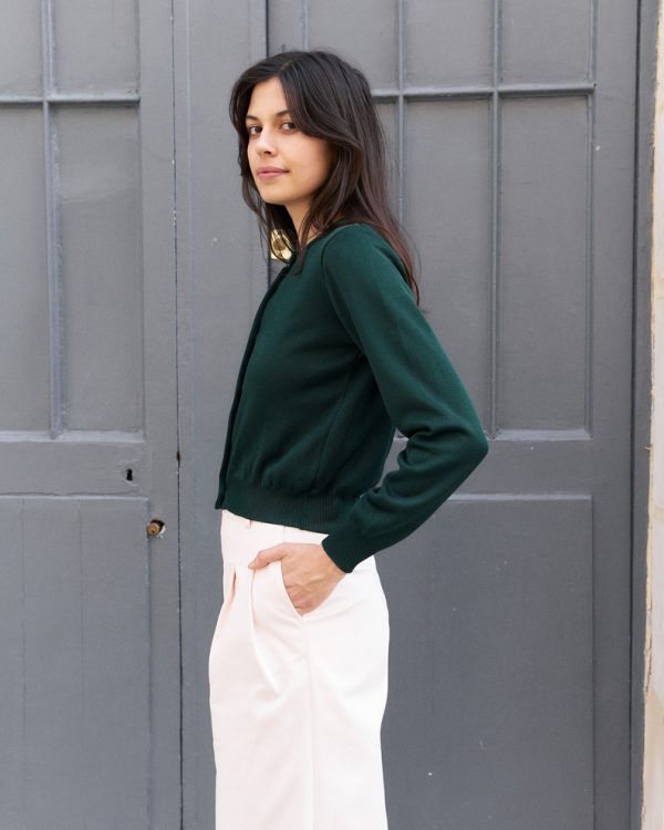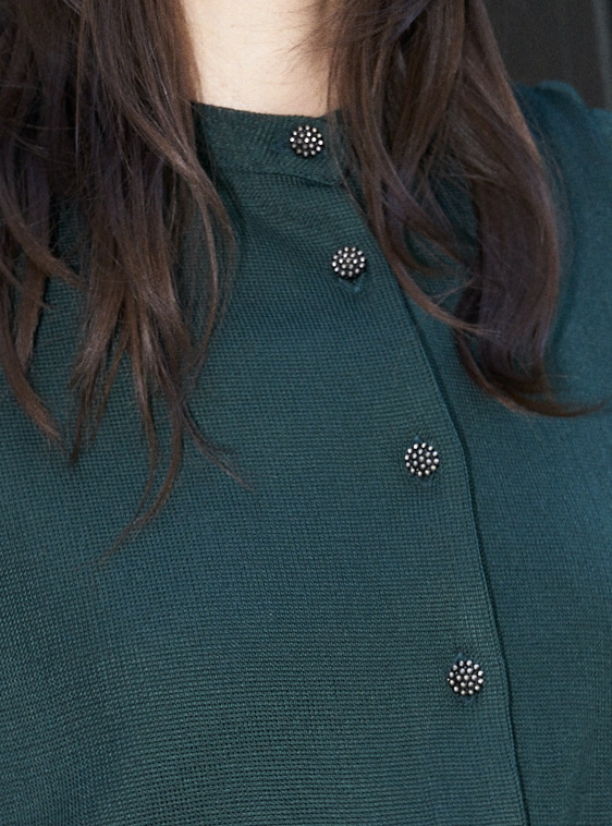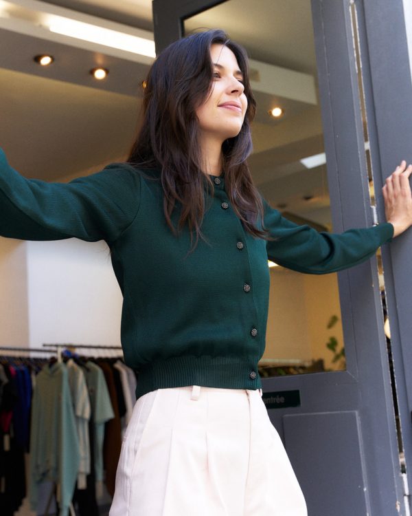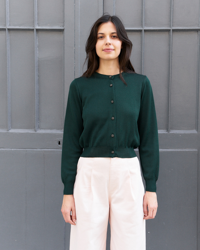 Cropped silk blend knit cardigan with hand made antique silver glass buttons.