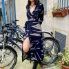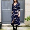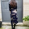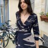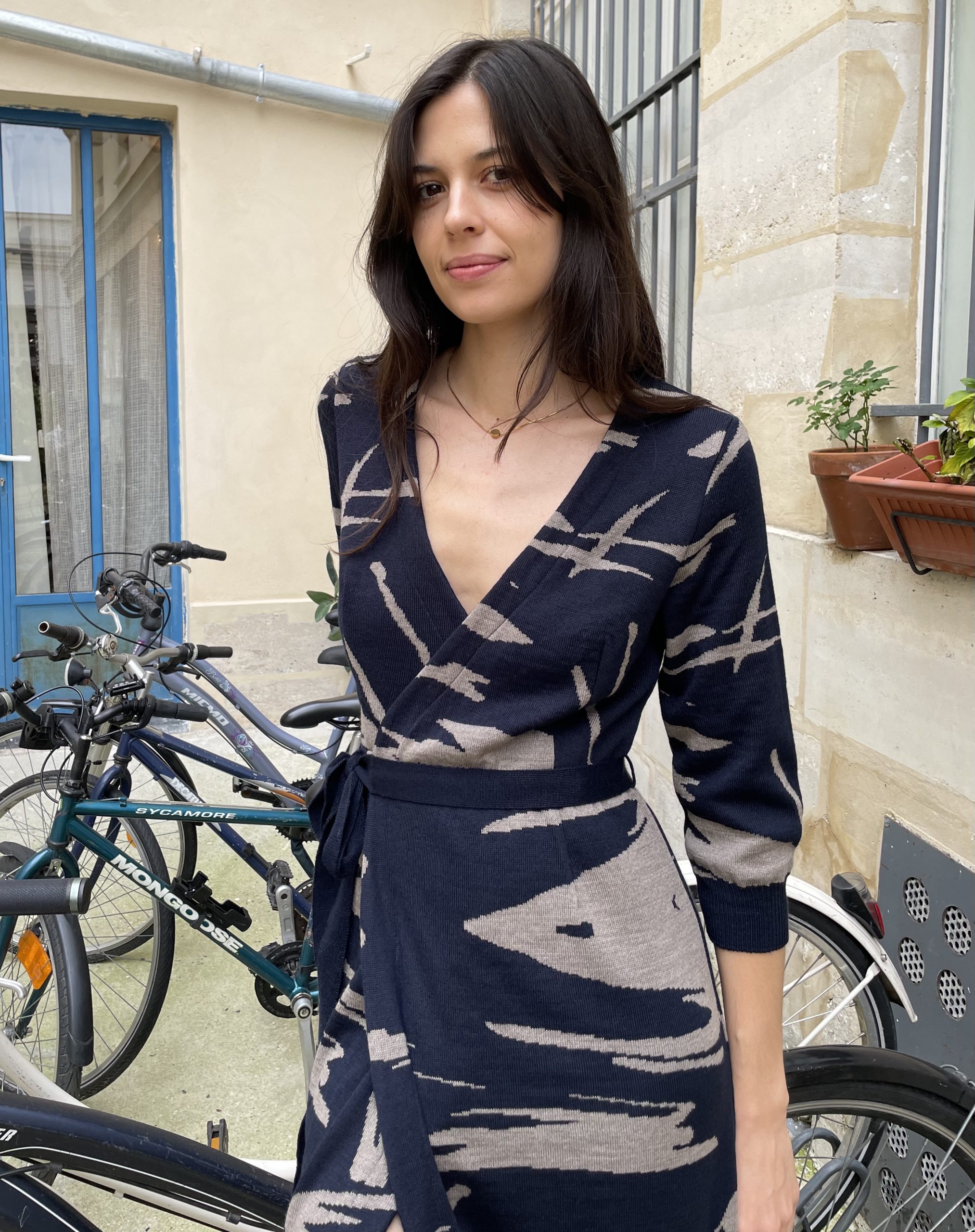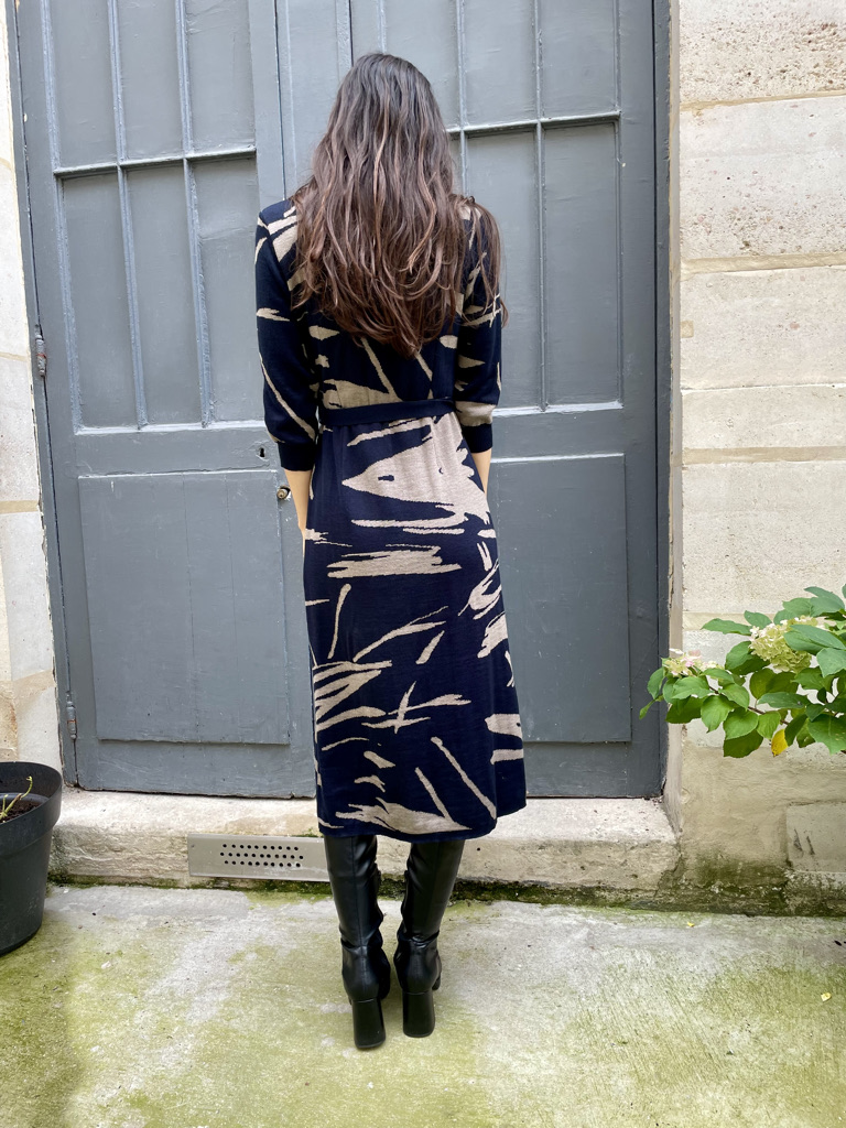 A sophisticated wrap dress crafted in a soft, luxurious knit for a comfortable yet refined silhouette. Designed with a slim, flattering fit that accentuates the body’s natural lines, it features an artistic paintbrush-inspired motif — warm beige strokes set against a deep night-blue background. Effortlessly balancing modern artistry and timeless femininity, this piece transitions seamlessly from day to evening.