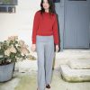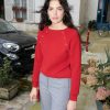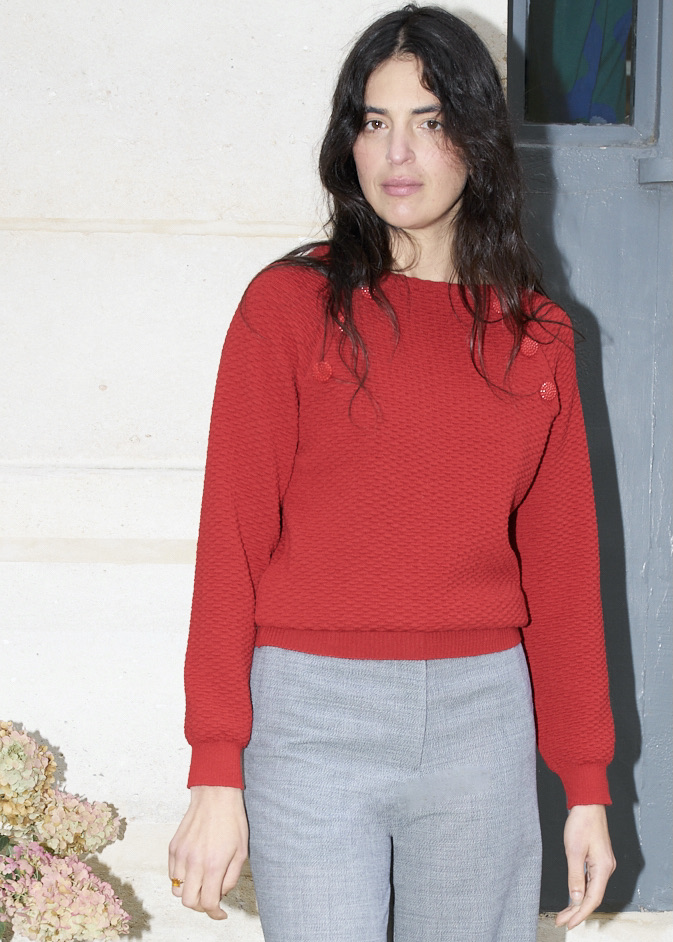 Textured knit boat neck sweater. It has two diagonal nautical style openings on each side of the neckline decorated with custom made glass buttons.