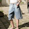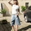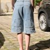 These wide-leg skater shorts reinterpret denim through an avant-garde lens. Cut from soft washed out denim, they showcase an upside down effect. The exaggerated wide-leg silhouette offers comfort and movement, channeling a rebellious skater energy with a fashion-forward edge. Finished with contrast light orange stitching, the piece nods subtly to classic denim codes while confidently breaking them. A standout essential for those who like their staples with a twist.