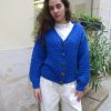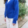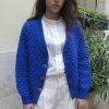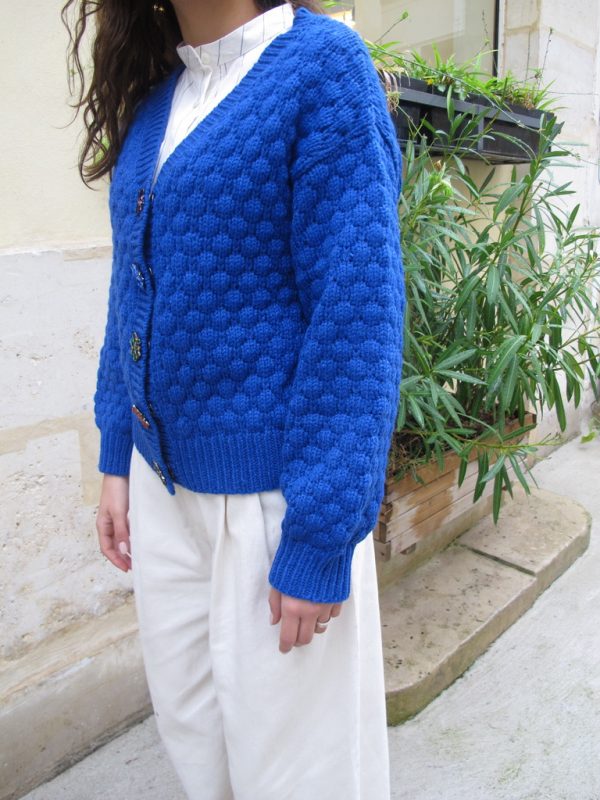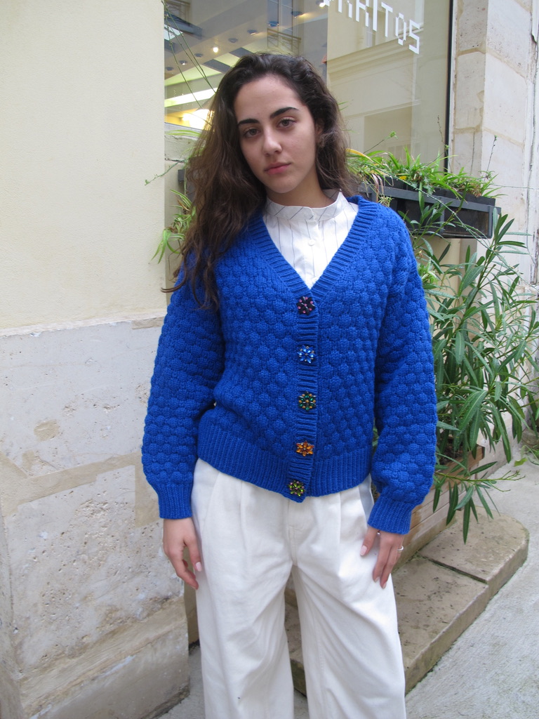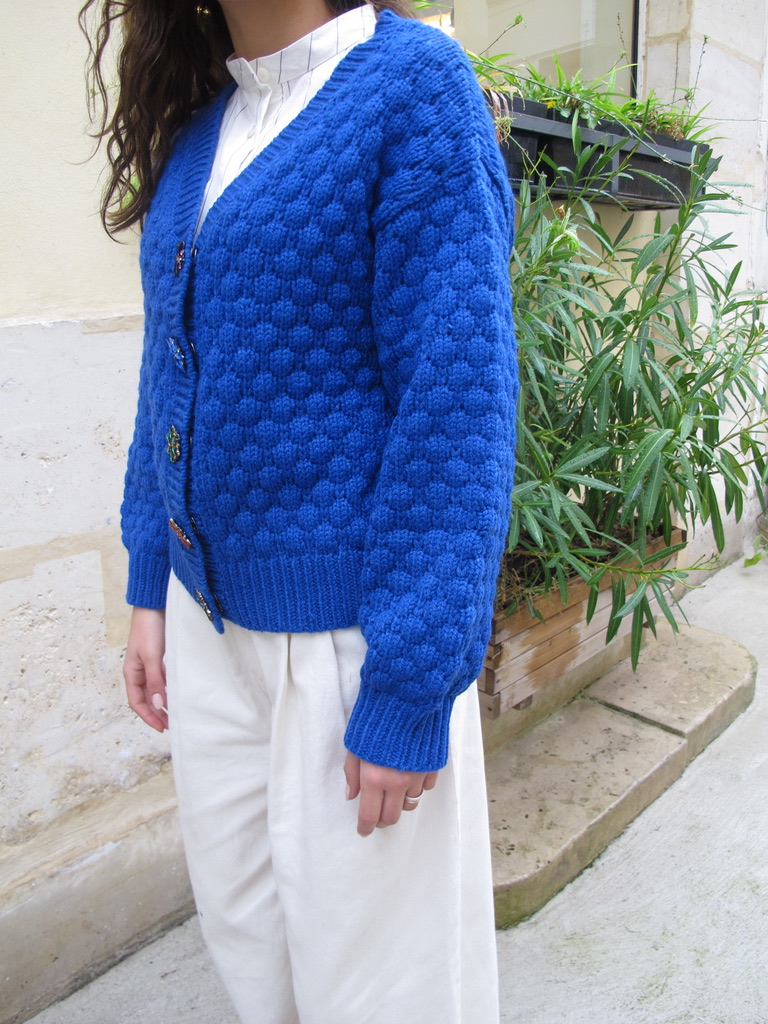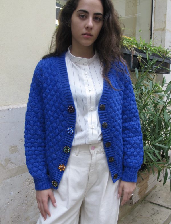 Chunky textured cosy cardigan with statement mismatched diamond bijoux buttons sitting on metallic snaps.