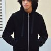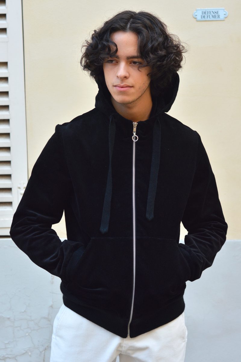 Blouson en velour côtelé noir coupe droite, manches longues, la veste possède une capuche avec cordons, une fermeture éclair centrale, 2 poches prise dans la découpe face avant et bords côtelés.