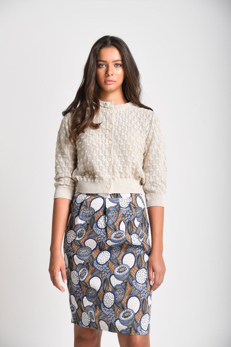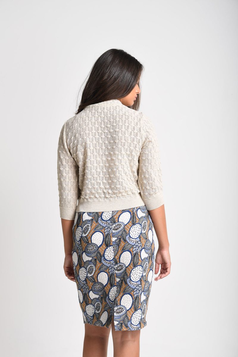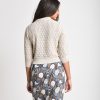Cardigan Lais en maille dentelle texturé et détail lamé. Le col est volanté et les manches sont ¾.