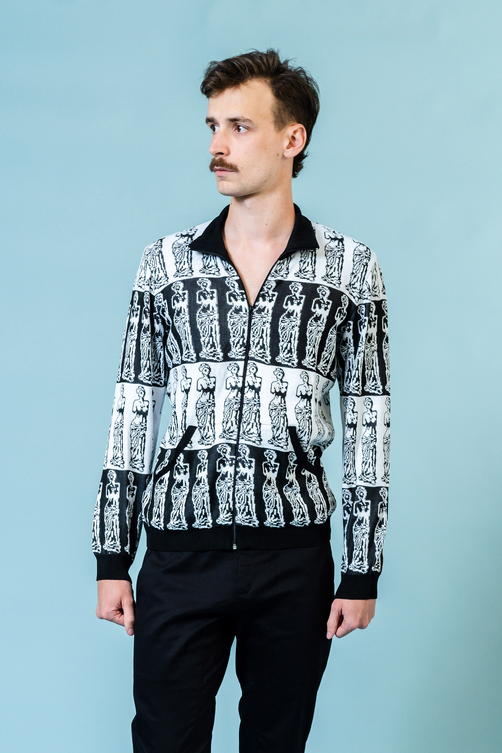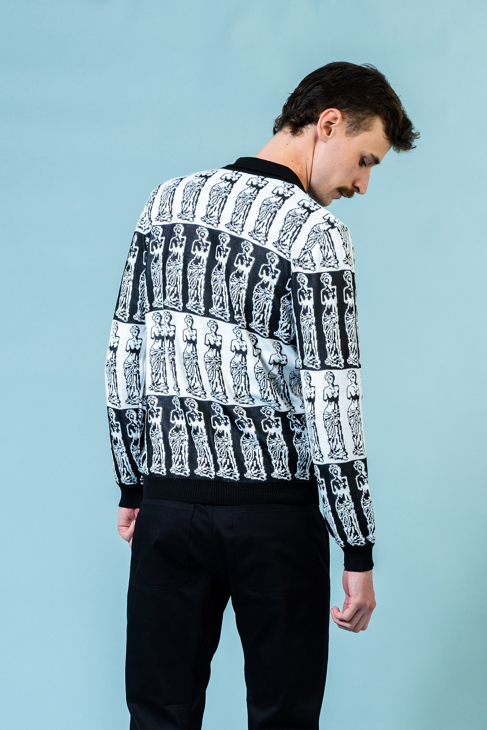 Veste en maille au motif aphrodite de milos, col montant et poches passepoilé. Il est doté d’une fermeture éclaire à l’avant.