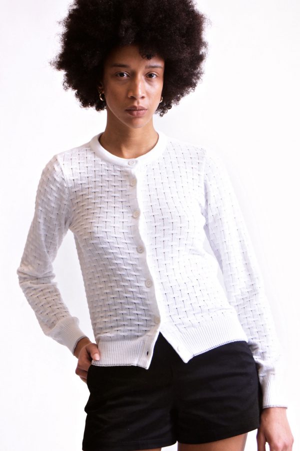 Textured knit white cardigan long sleeves with lamé trimmings.