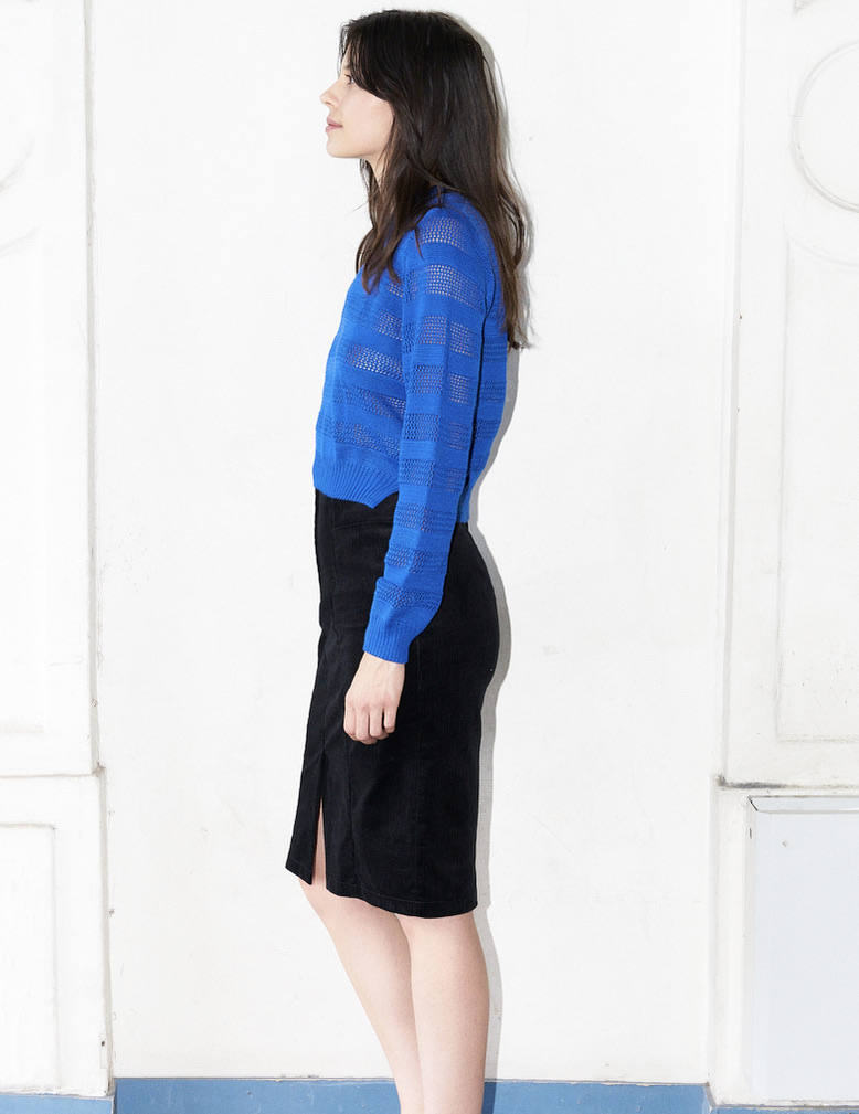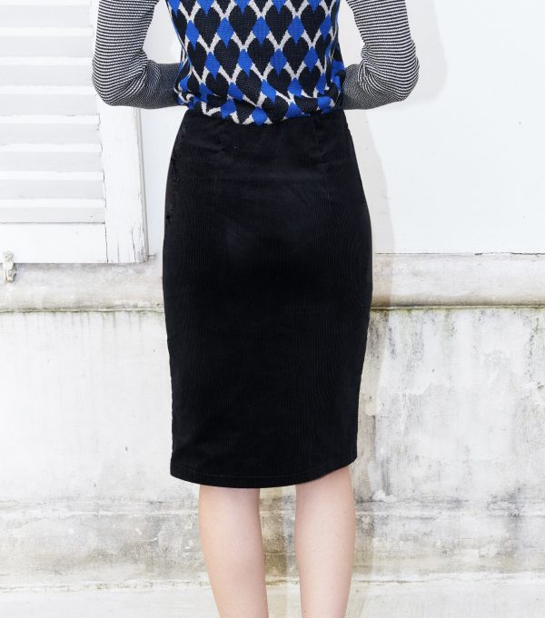 Corduroy tailored pencil skirt. It has two front pockets and a back slit.
