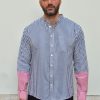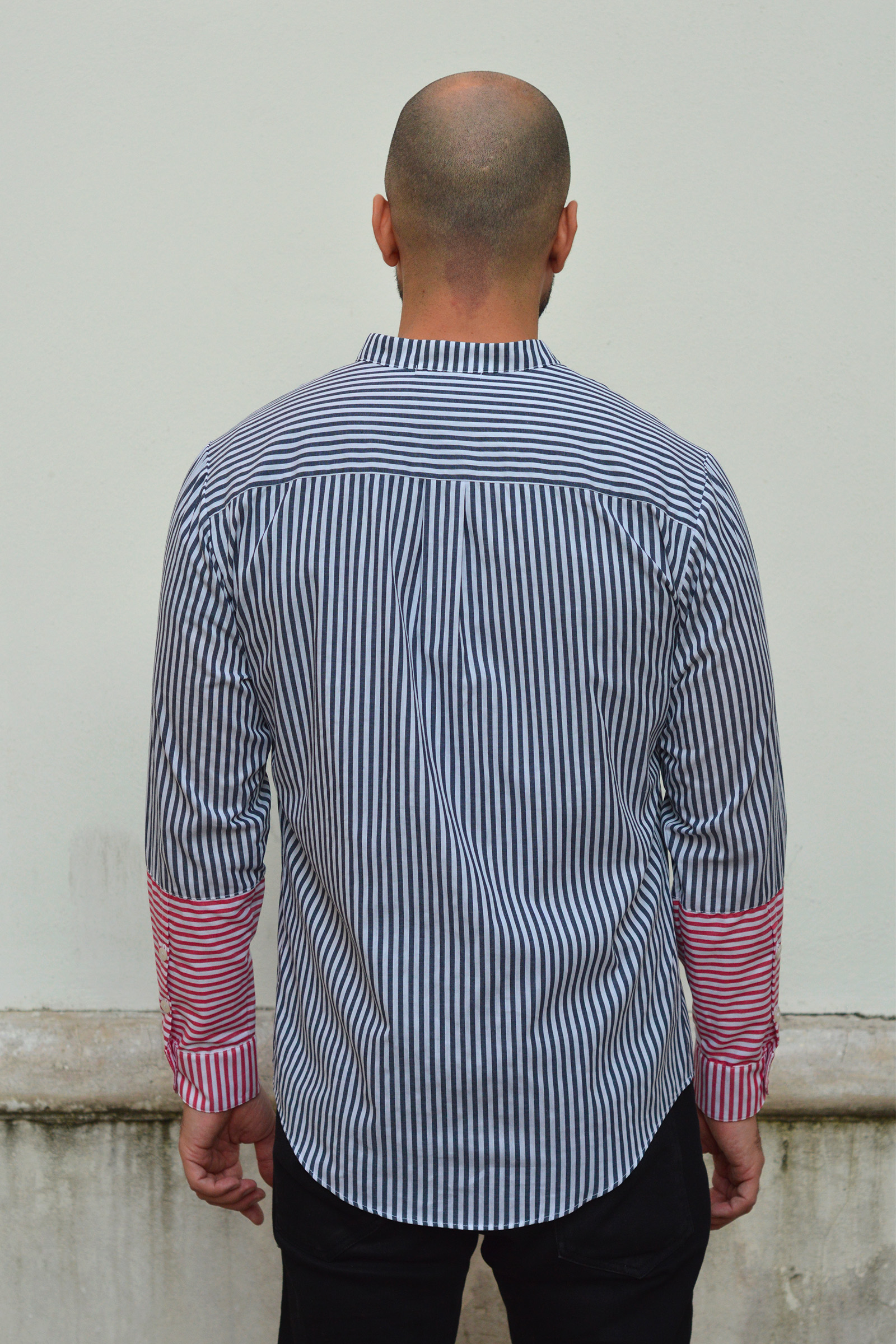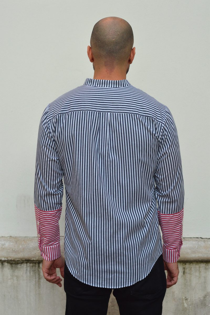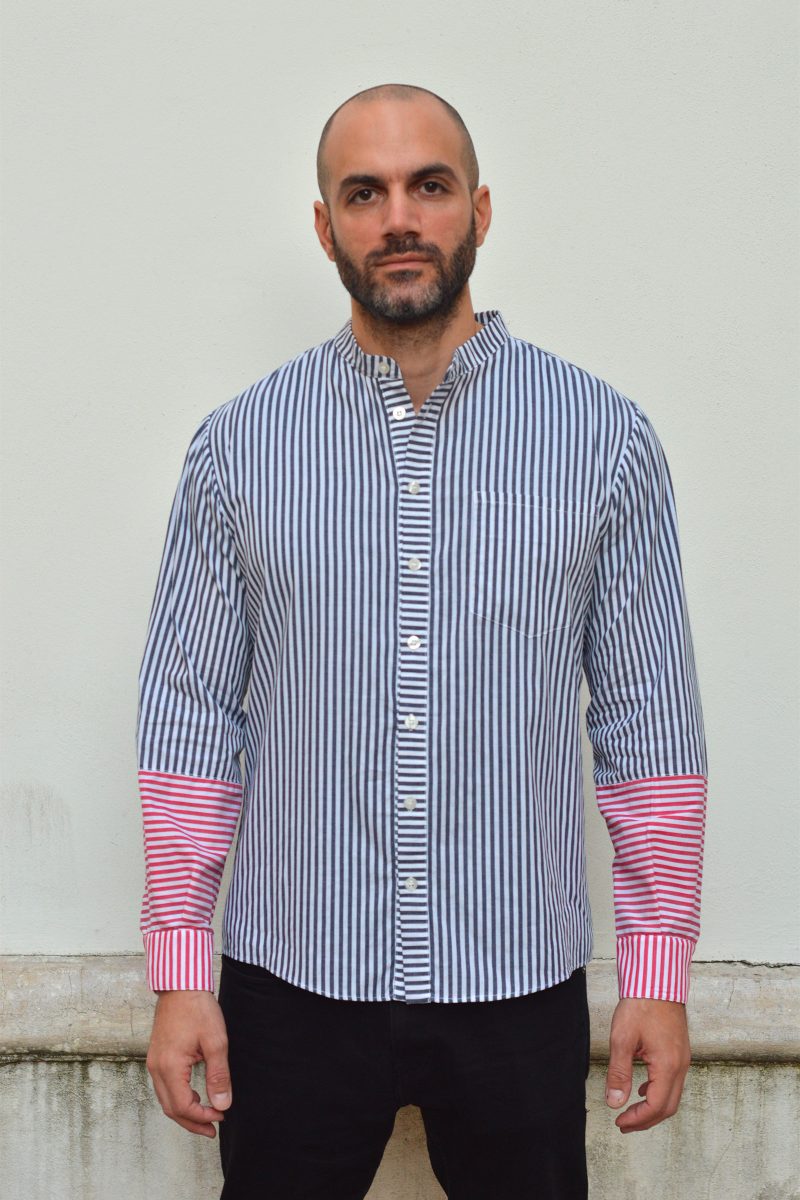 Chemise à rayures, col mandarin et poche plaquée, jeux de rayures au niveau des avants bras.