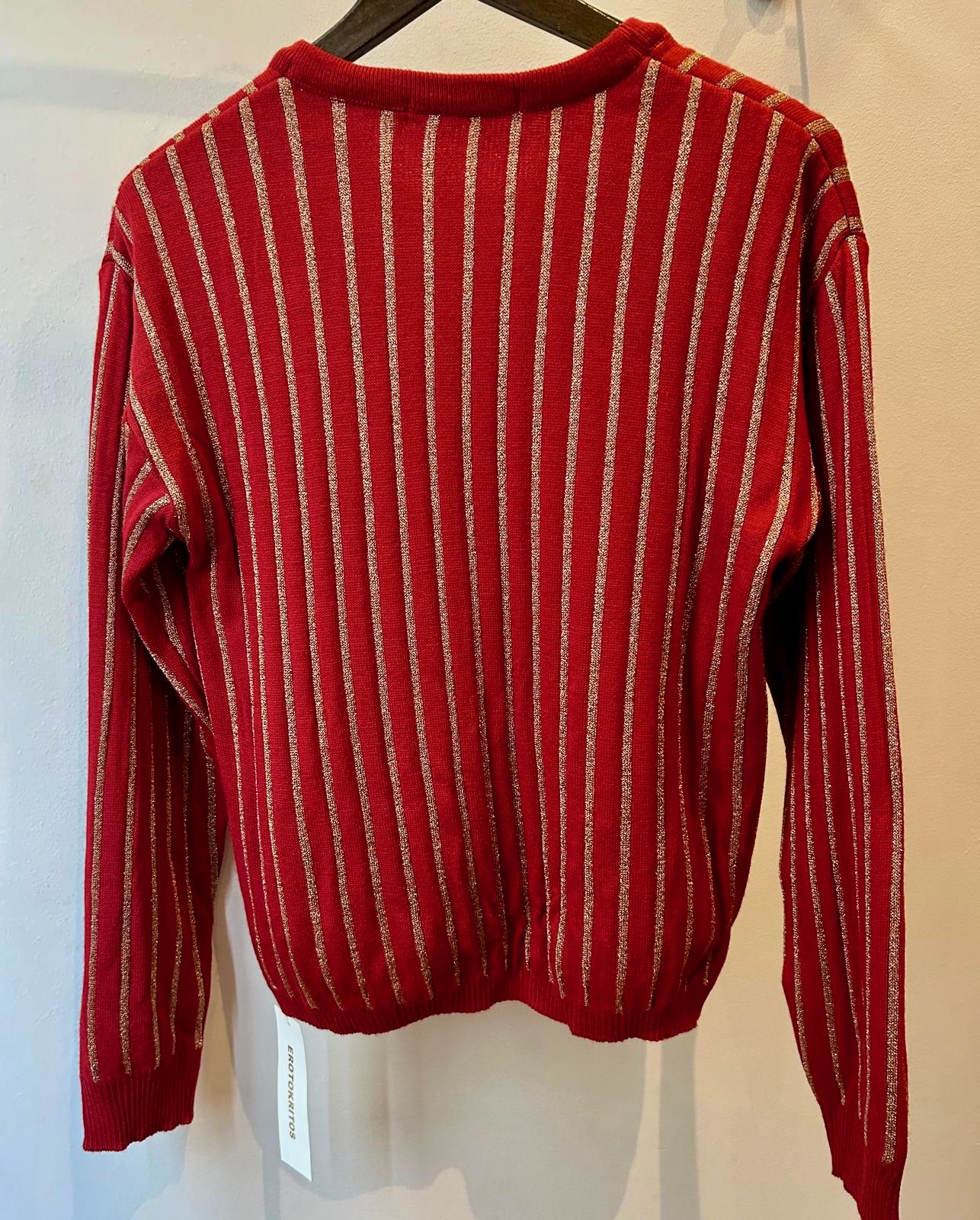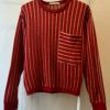 Vertical sripe soft sweater with contrast large pocket and Lurex details.