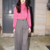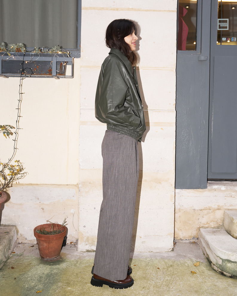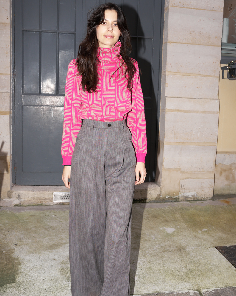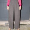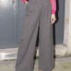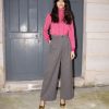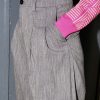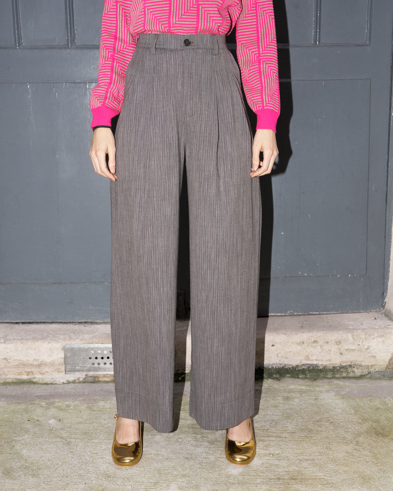 High waist wool pants with two side pockets, belt loops and front zip fastening and large reversible hem. Pleats at the front give extra volume to this wide leg fit. Made from lightweight wool.
