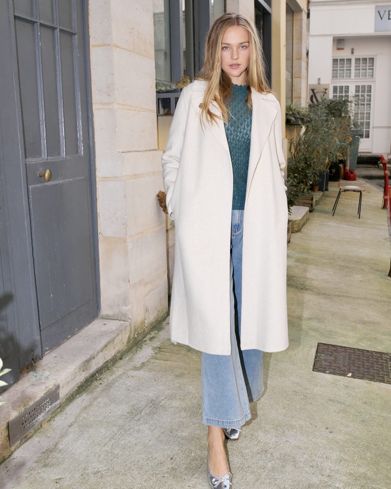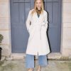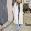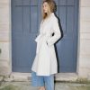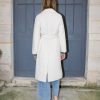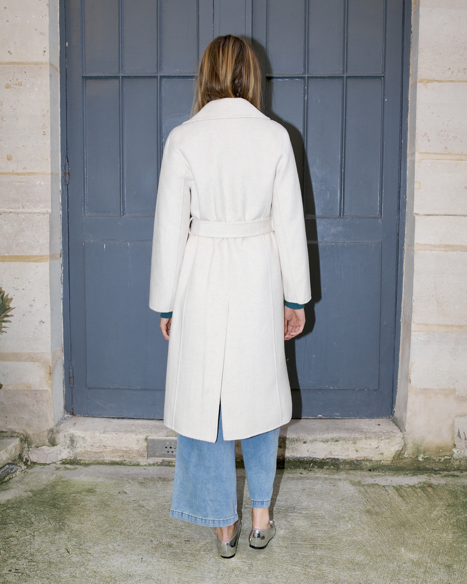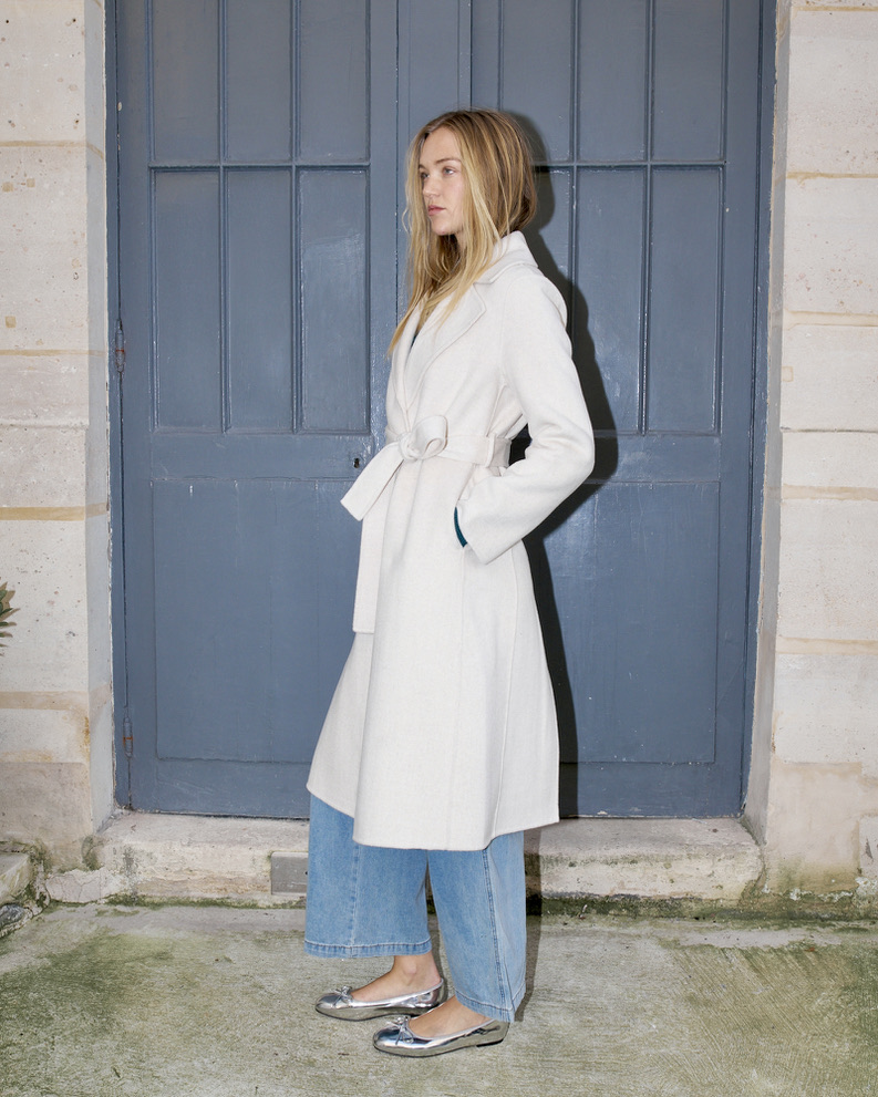 Off white long belted coat with hand stitched metallic snap neck closing made from double face soft cashmere wool.