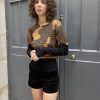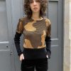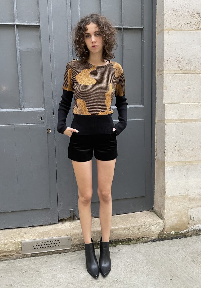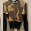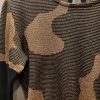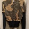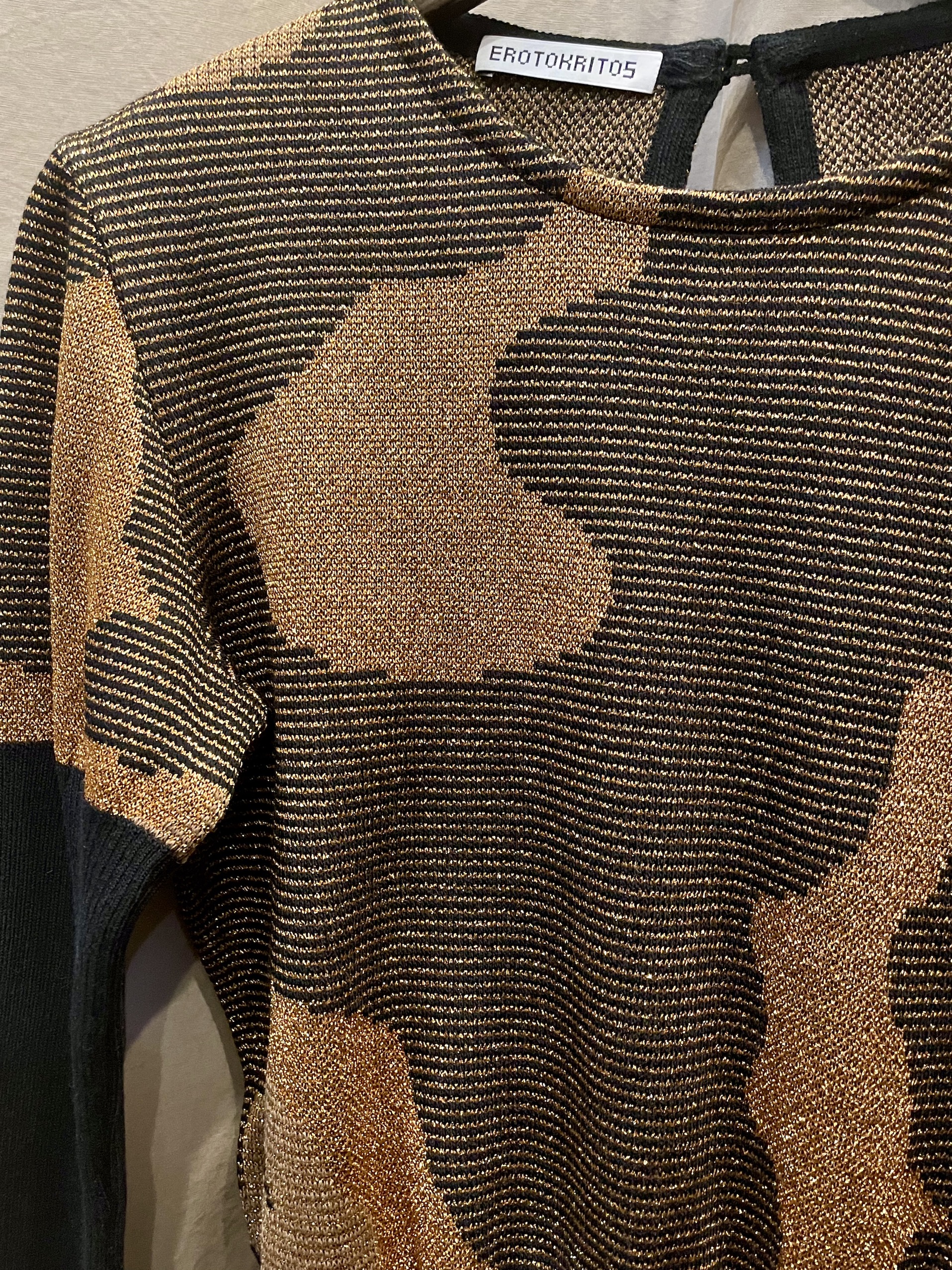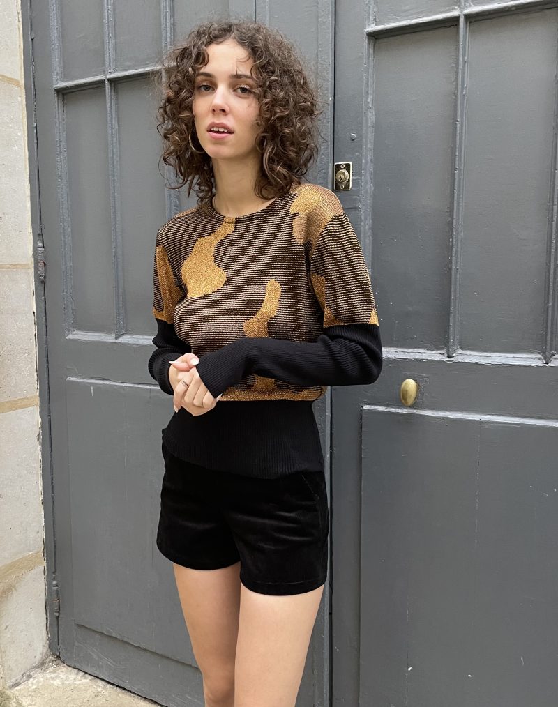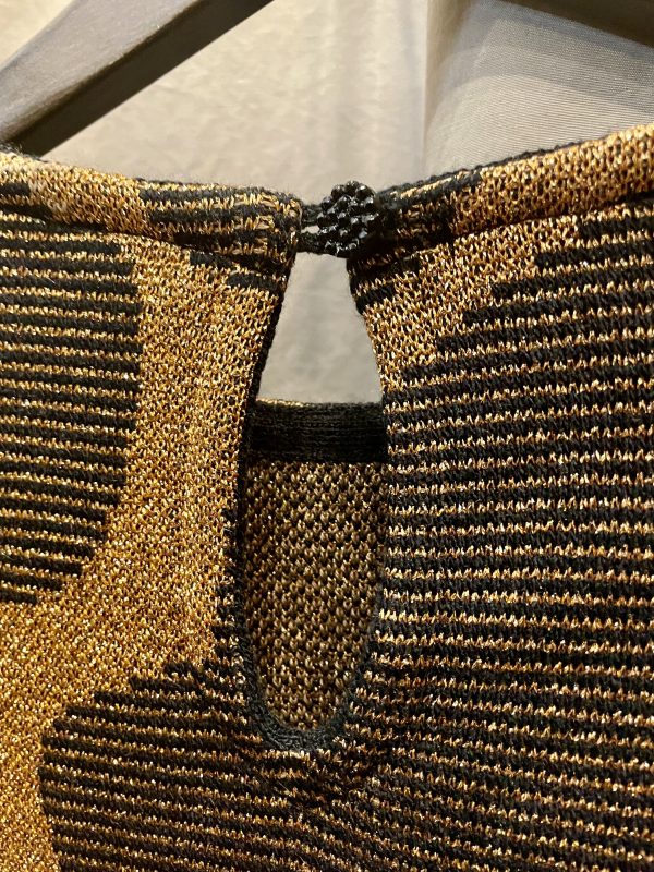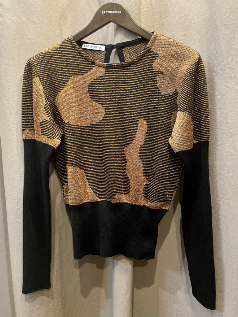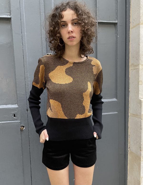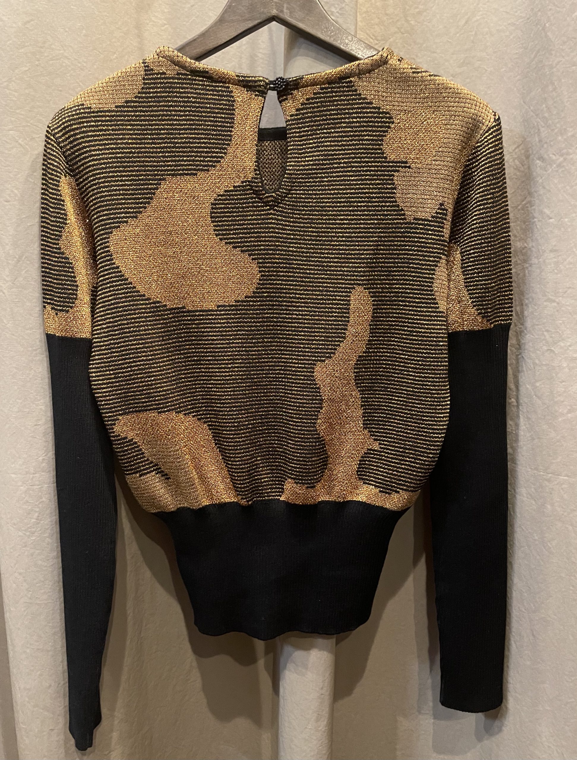 Gold metallic and black Jacquard sweater with abstract pattern. It has contrast flattering large ribbed waist and long ribbed sleeves.