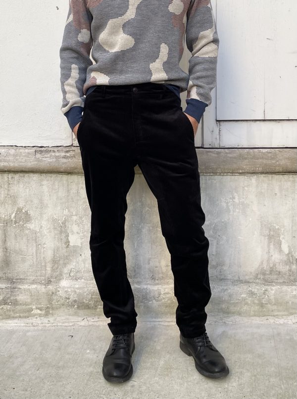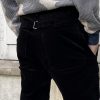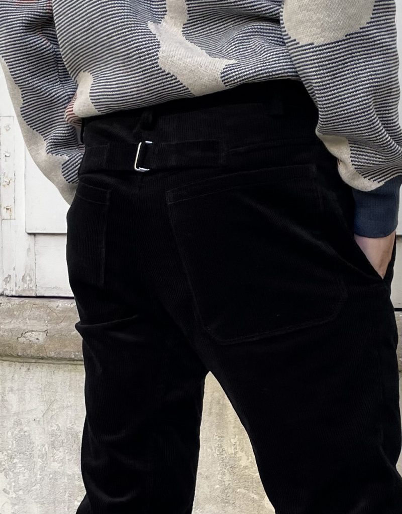 Inspired from 1940s French utility pants these stylish corduroy carrot shape trousers feature two deep side pockets, two back pockets and a buckle detail on the back.