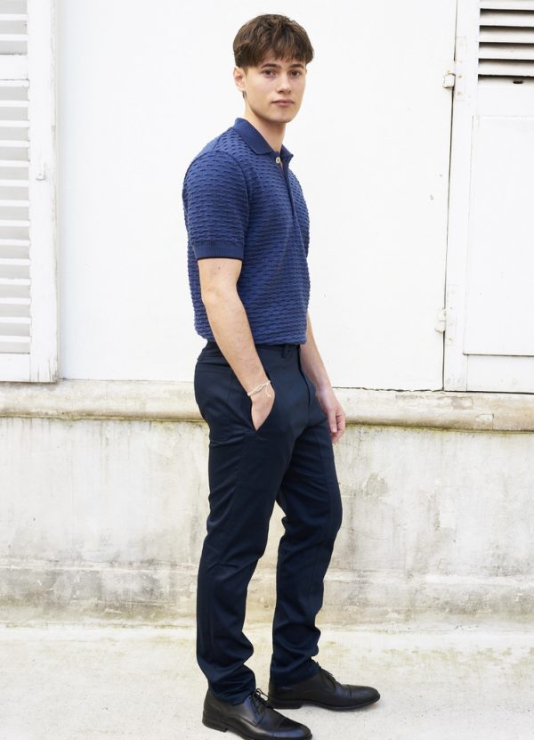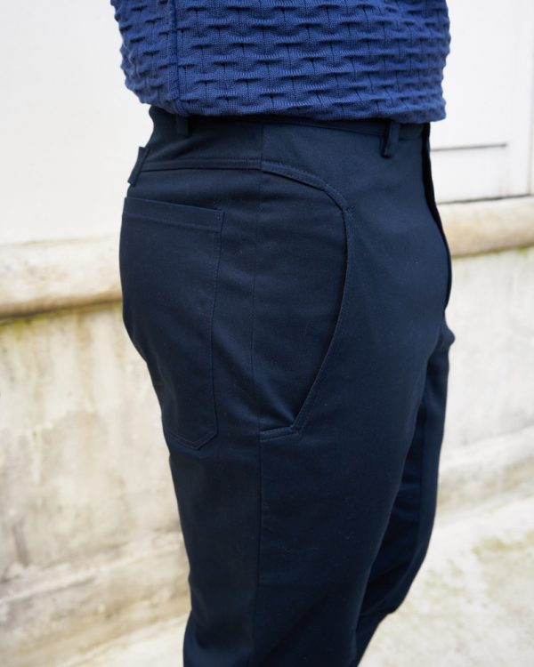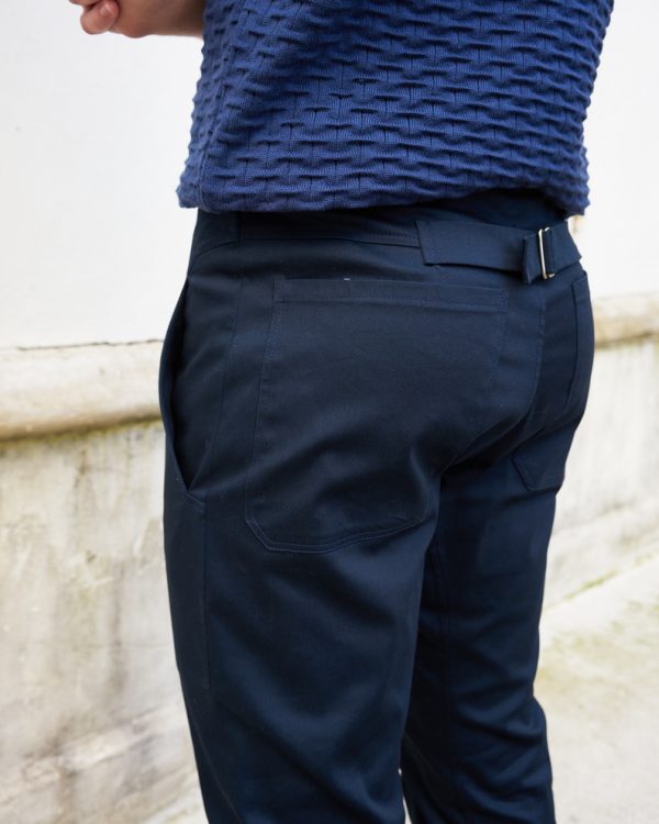Slightly baggy high waist pant with a sophisticated cut, inspired from 1950’s french work wear, It has four deep pockets and an adjustable strap on the back.