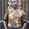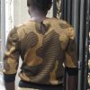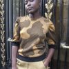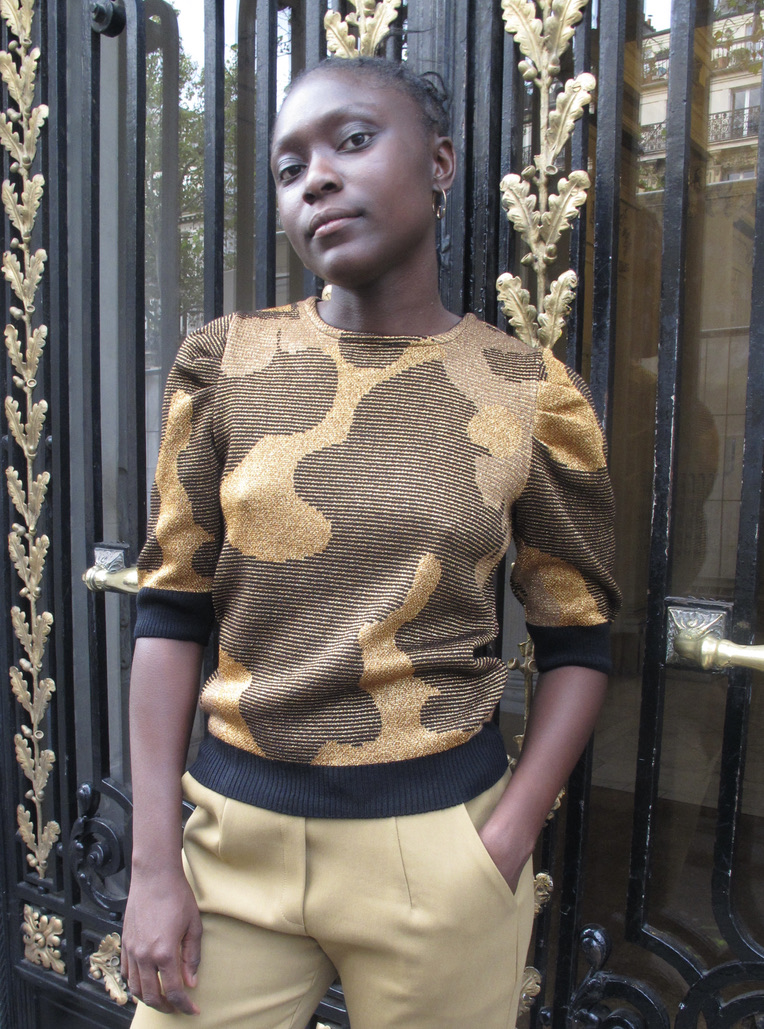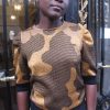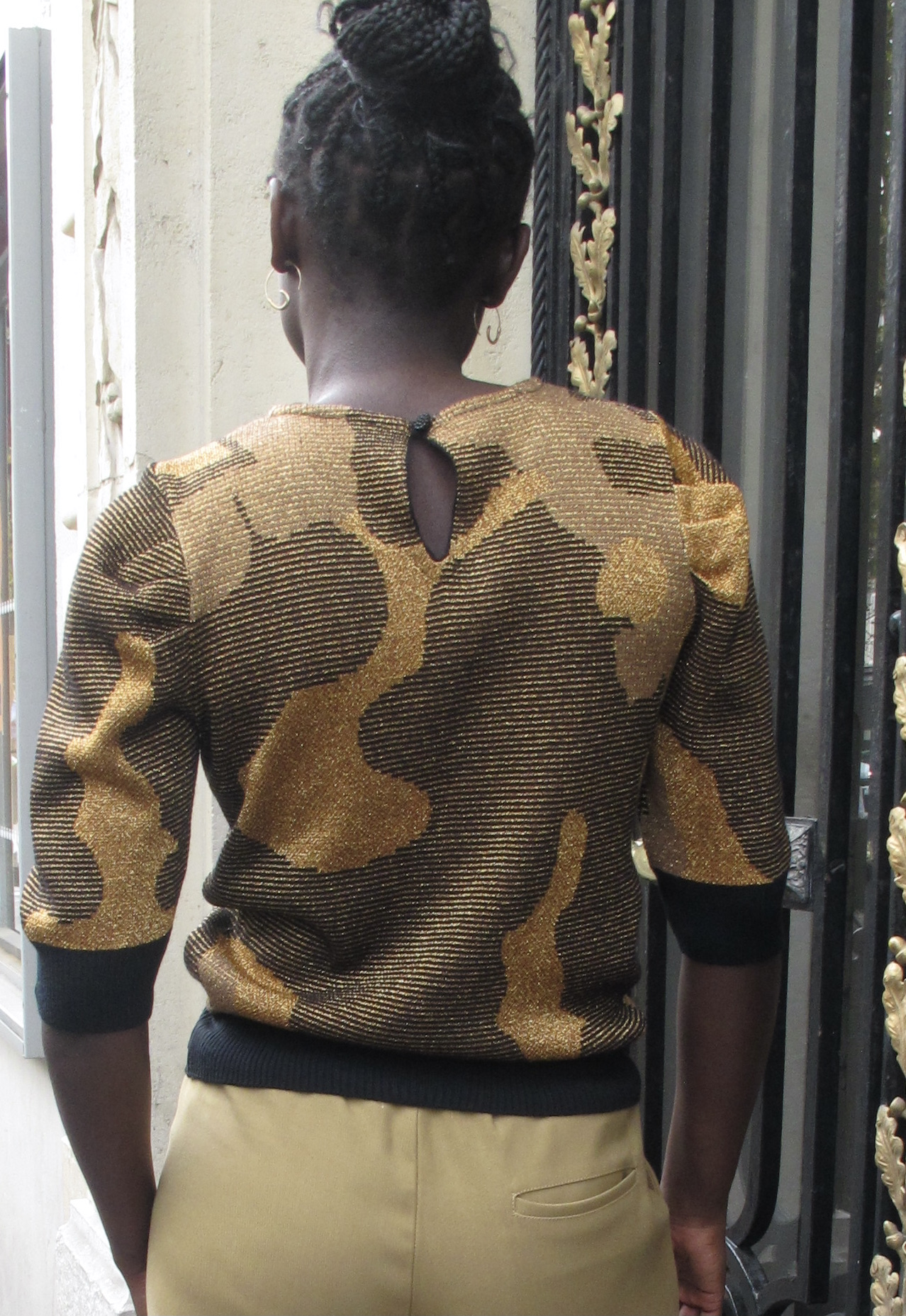 Abstract pattern jacquard sweater with puff elbow length sleeves and tear drop closing on the back, Inspired from 1940s knitwear. The gold Lurex adds a glamorous sparkle to the knit.