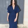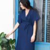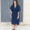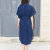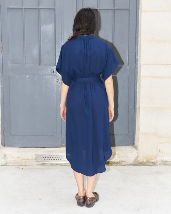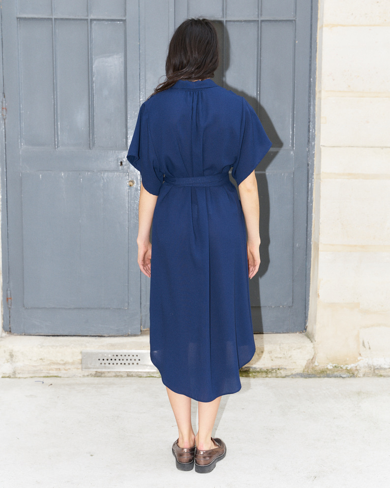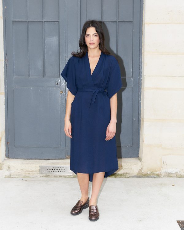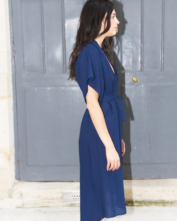 Comfortable and elegant kimono style midi dress, It features an asymmetric hemline, a belt in the same fabric and diagonal pockets. The shape is very size flexible and it can be belted according to each body shape.