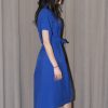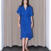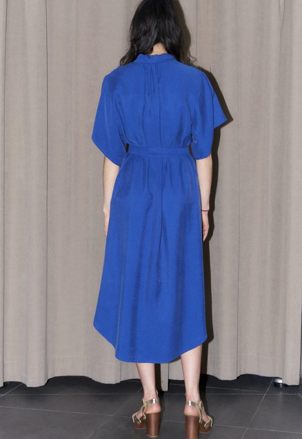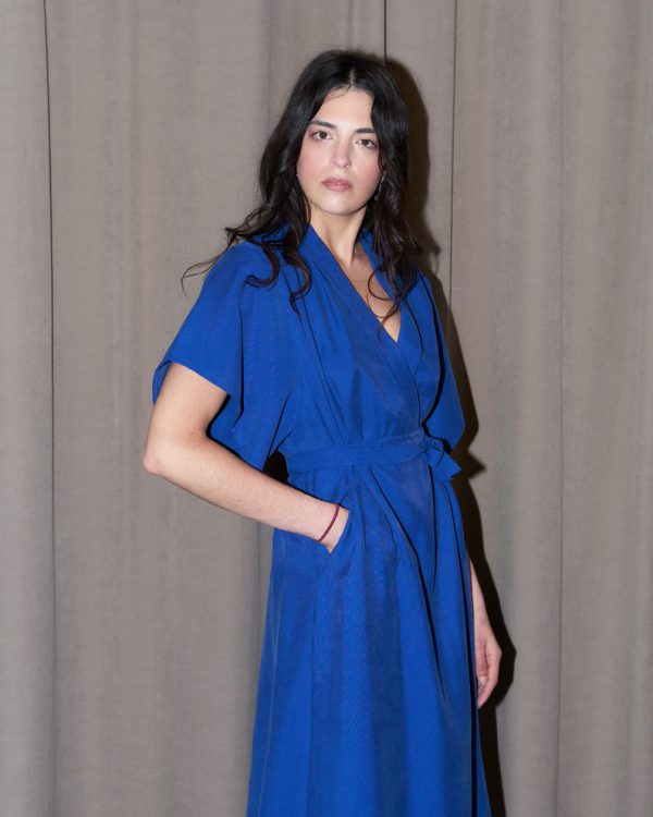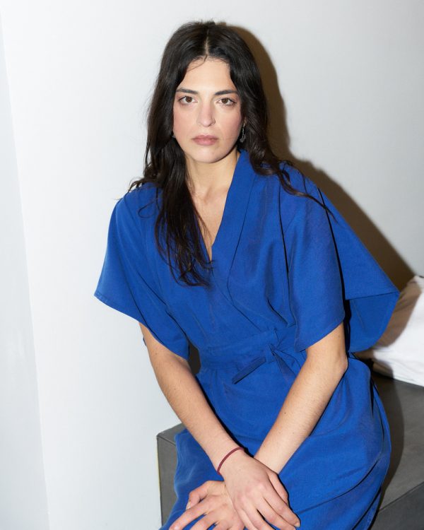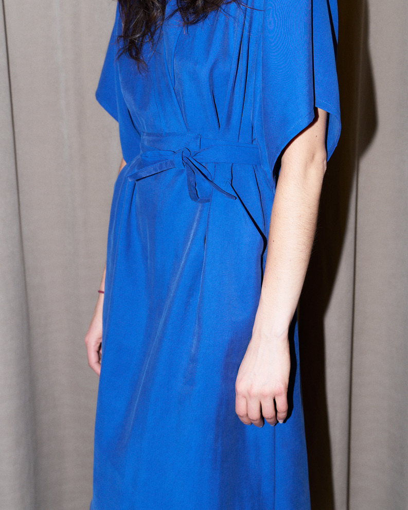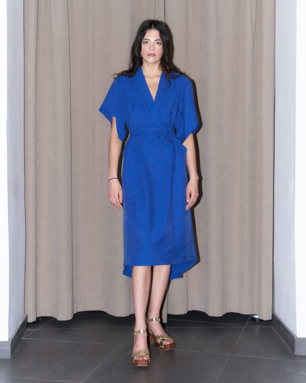 Comfortable and elegant kimono style midi dress, It features an asymmetric hemline, a belt in the same fabric and diagonal pockets. The shape is very size flexible and it can be belted according to each body shape. This luxury fabric has a semi satin finish.