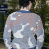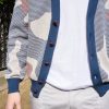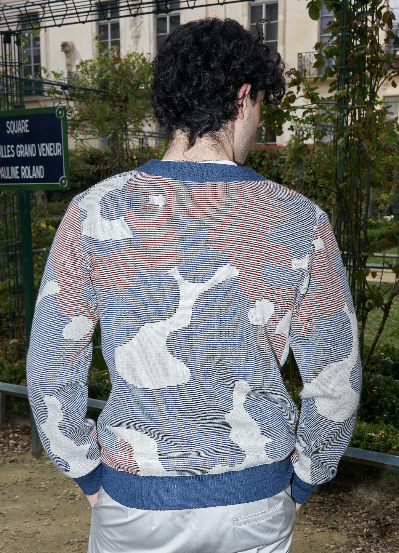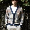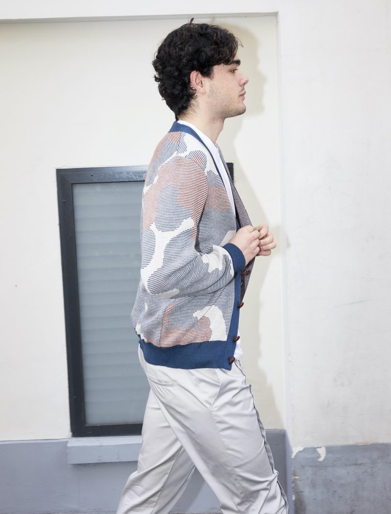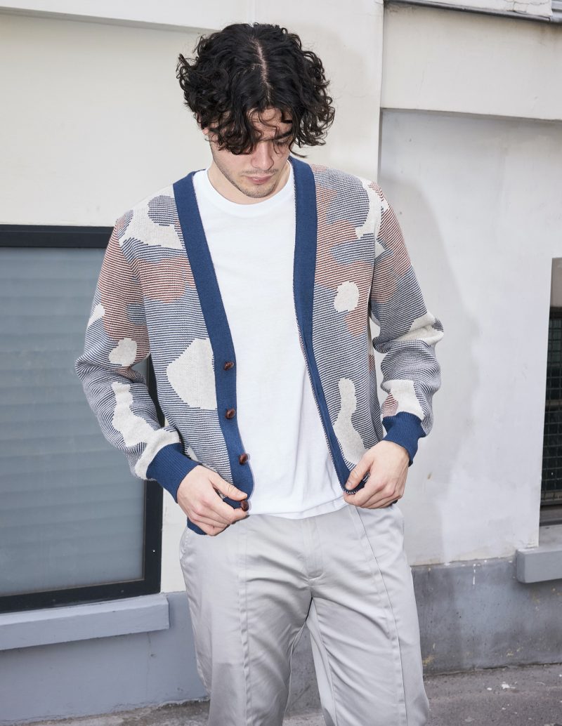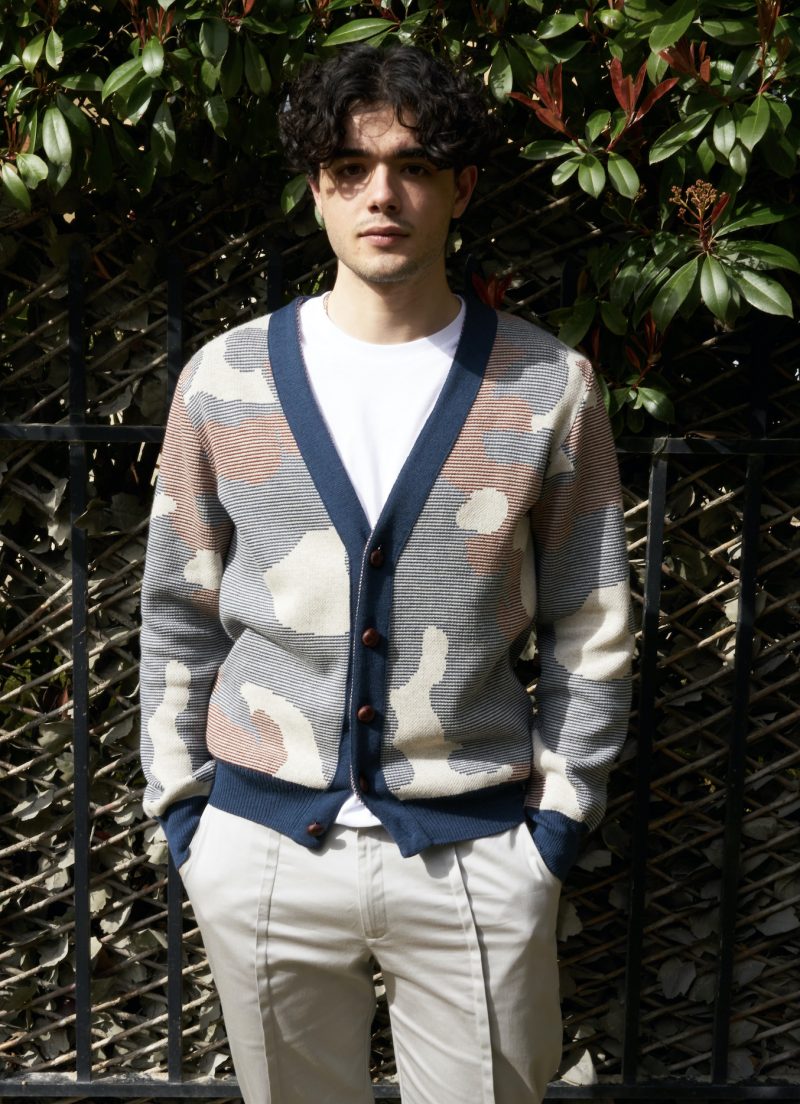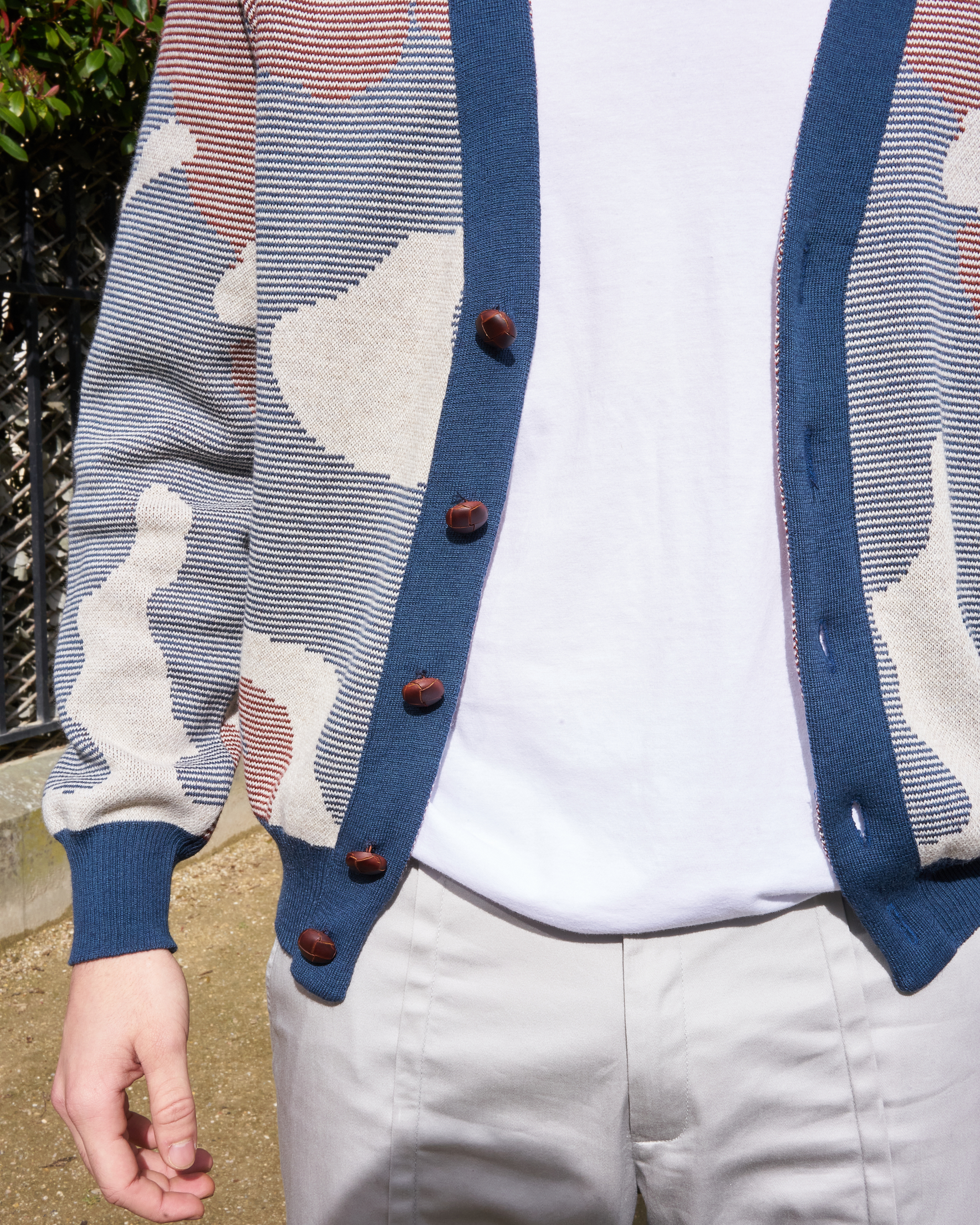 Abstract motif jacquard knit V neck cardigan with leather buttons.
