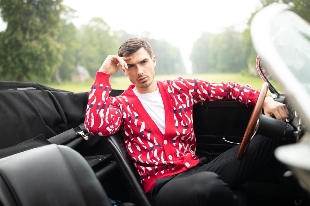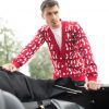 Zebra motif jacquard knit V neck cardigan with leather buttons.