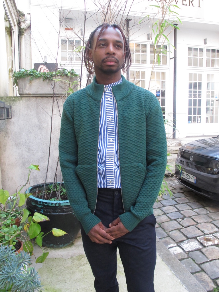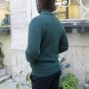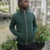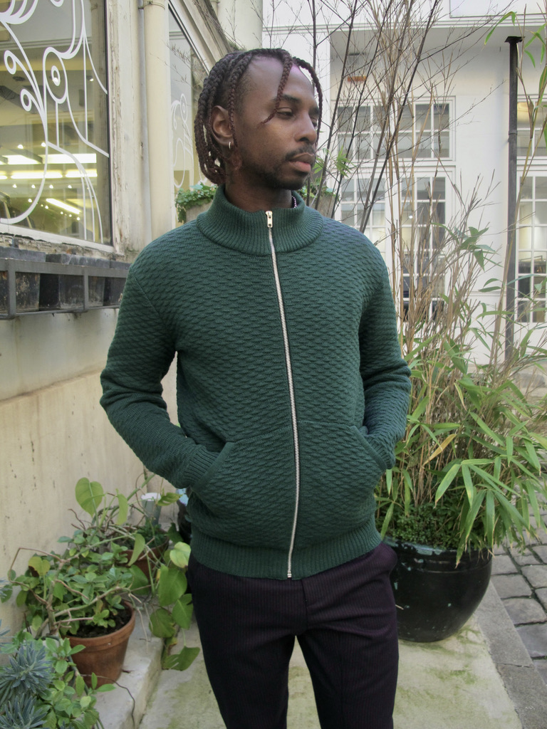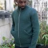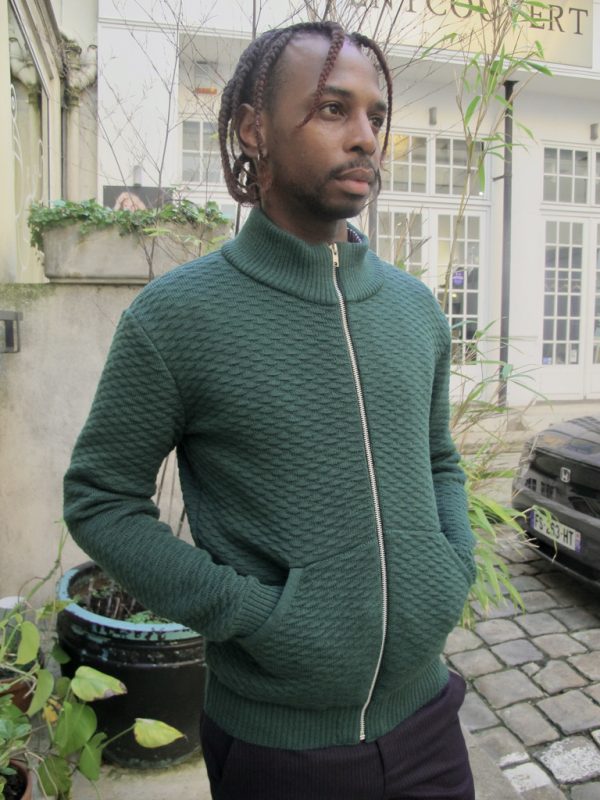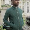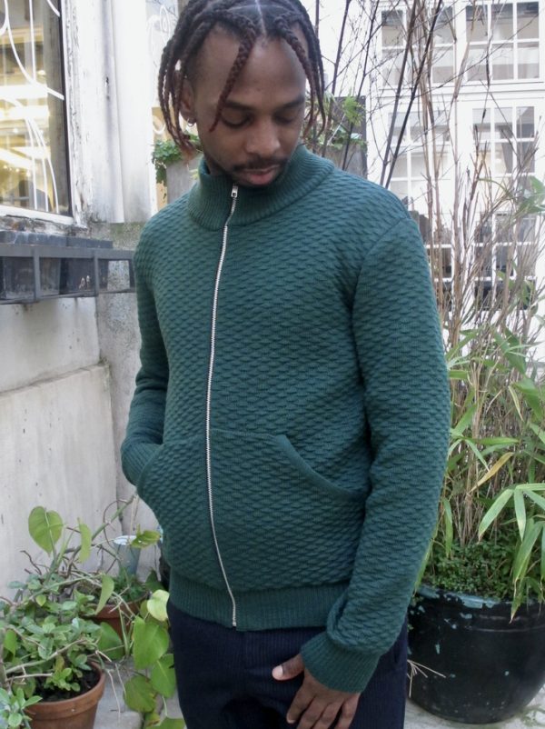 Bottle Green textured knit jacket with metallic zip closure, long sleeves and high collar and kangaroo pockets.