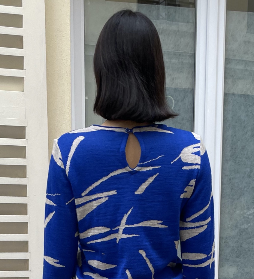 Crafted from a soft 50/50 cotton–wool blend, this rich royal-blue sweater is adorned with an abstract beige paintbrush motif, giving it a modern, hand-drawn feel. The silhouette is relaxed with long sleeves and a subtle round neckline, while the back reveals a delicate water-drop opening fastened with a small button.