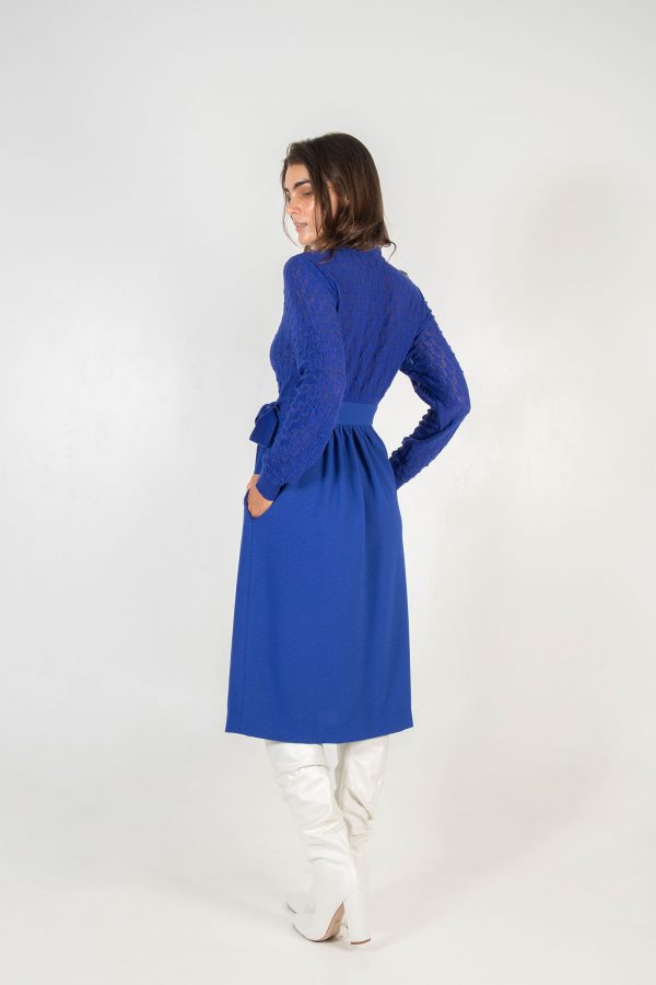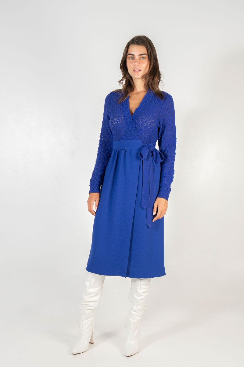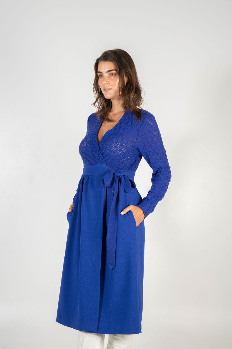 Mixed fabric wrap dress; Top part in lace knit and skirt in crepe with pockets.