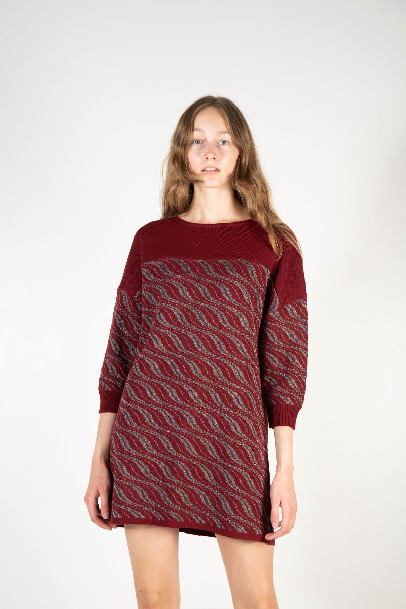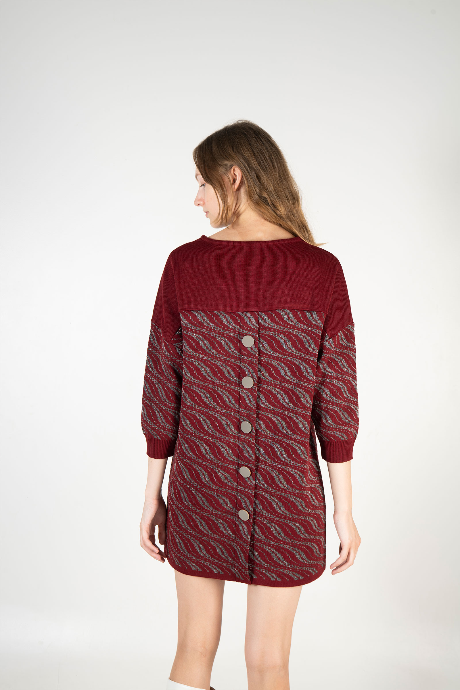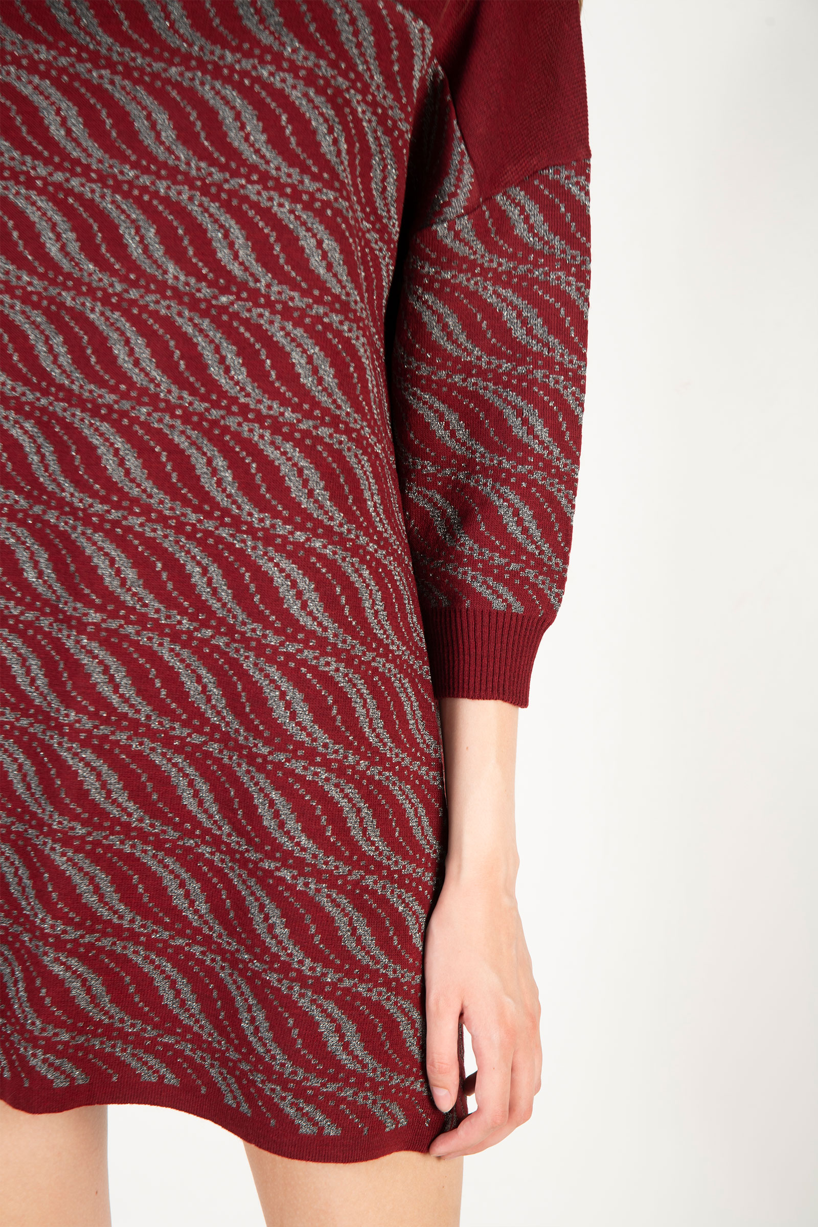 Sweater dress in intarsia with Lurex details and drop shoulder sleeves. Faux buttoning on the back.
