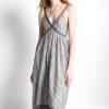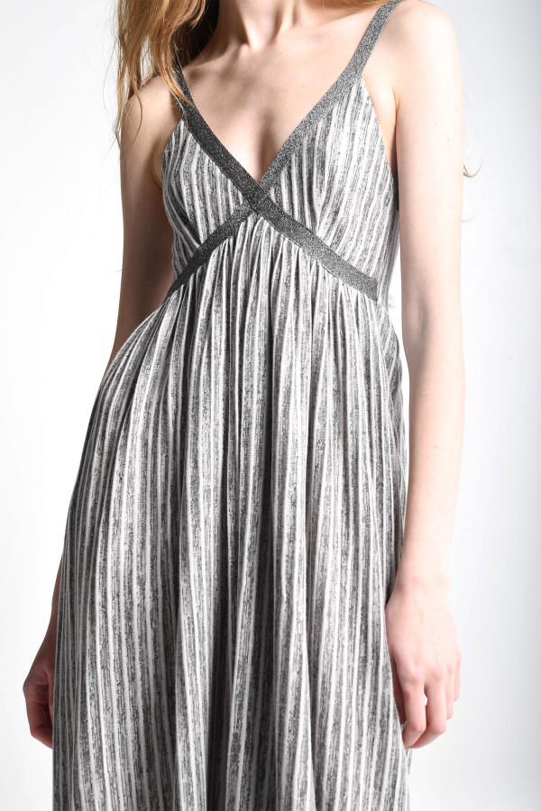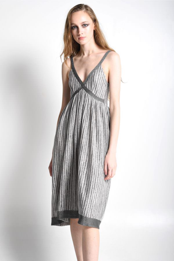 Strap dress in melange stripe jersey with iridescent knit trimmings and side zip. Skirt is lined in stretch tull.