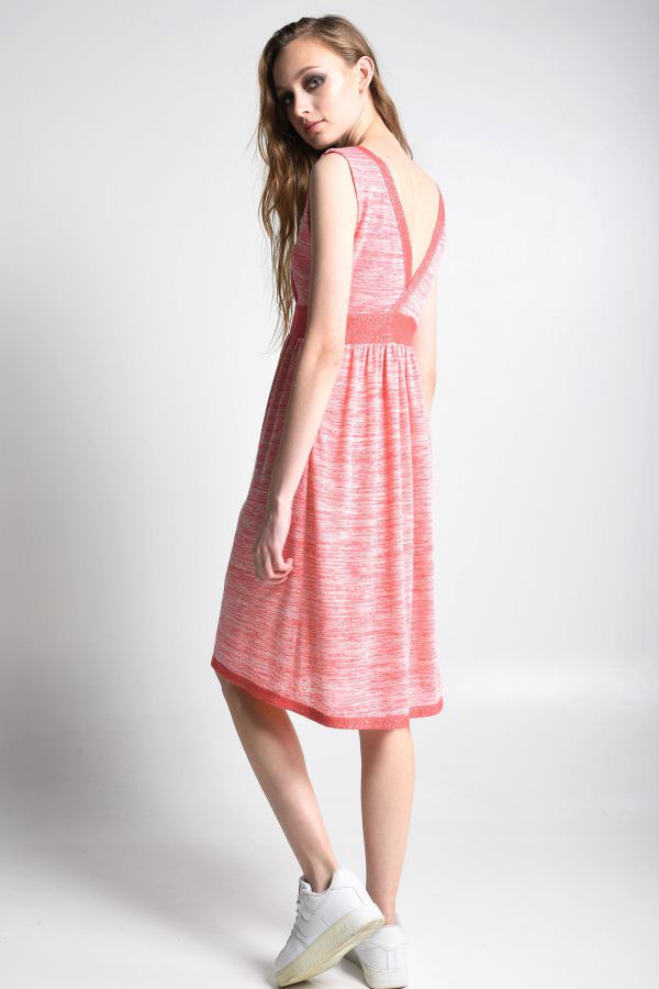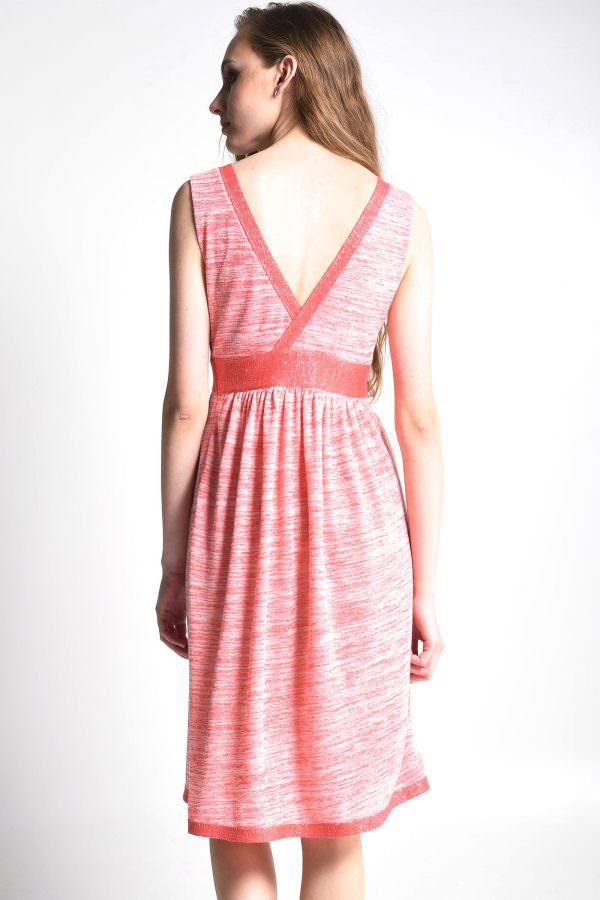 Deep V neck jersey melange dress with iridescent knit elasticated belt and trimmings. It has a gathered below the knee skirt and a zip opening on the side. Skirt is fully lined in stretch tulle.