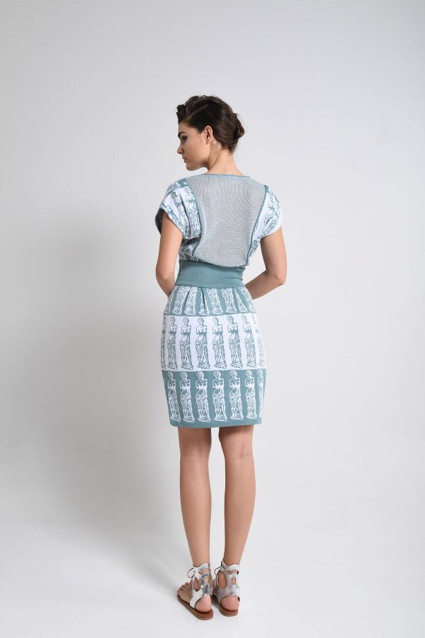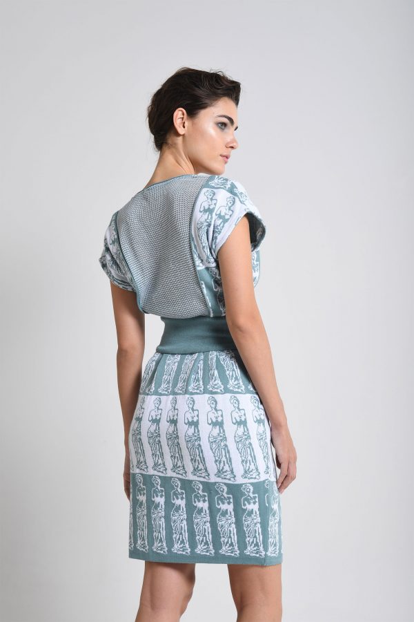 Knit dress with aphrodite of milos pattern adjustable cap sleeves and mesh knit cut out on the back.
