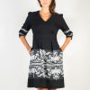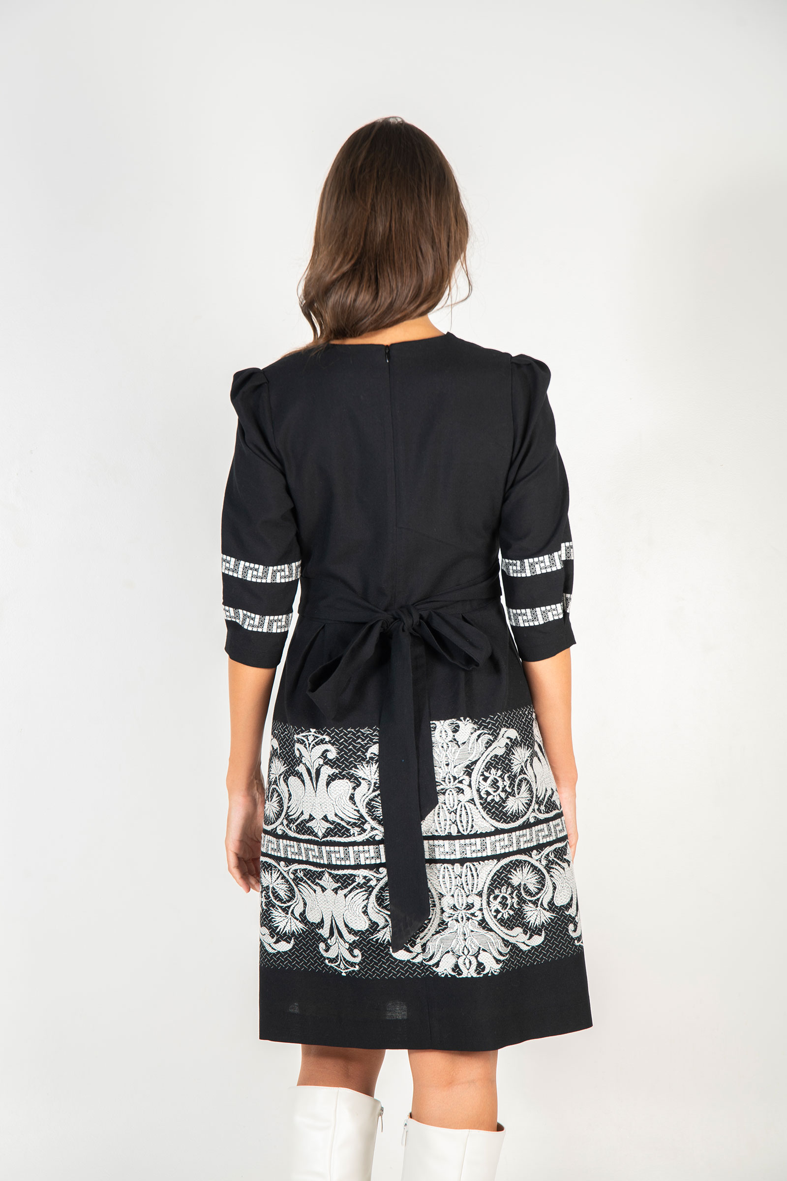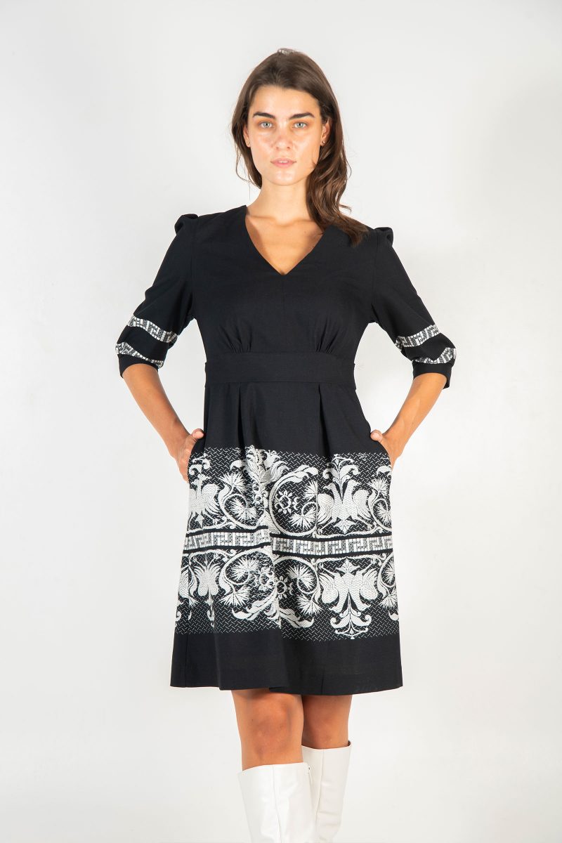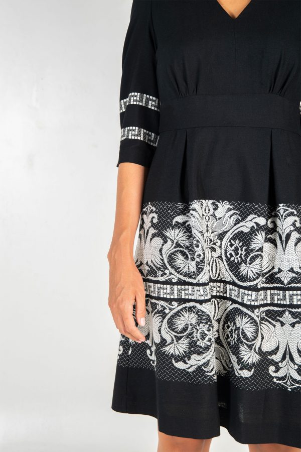 High Waist dress in cotton embroidered with traditional greek pattern. Adjustable belt on the back, skirt with two large pleats, pockets and ¾ sleeves. The dress is fully lined.