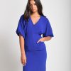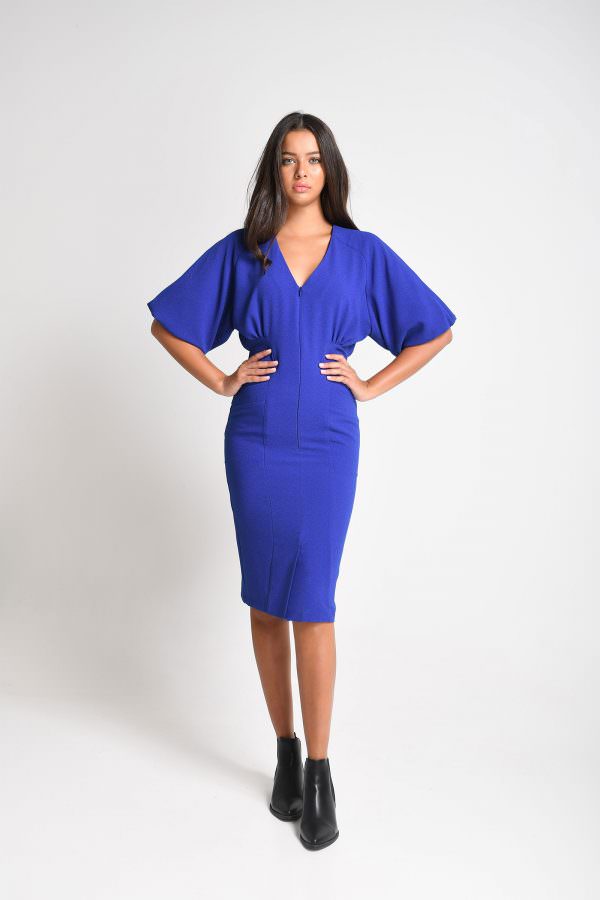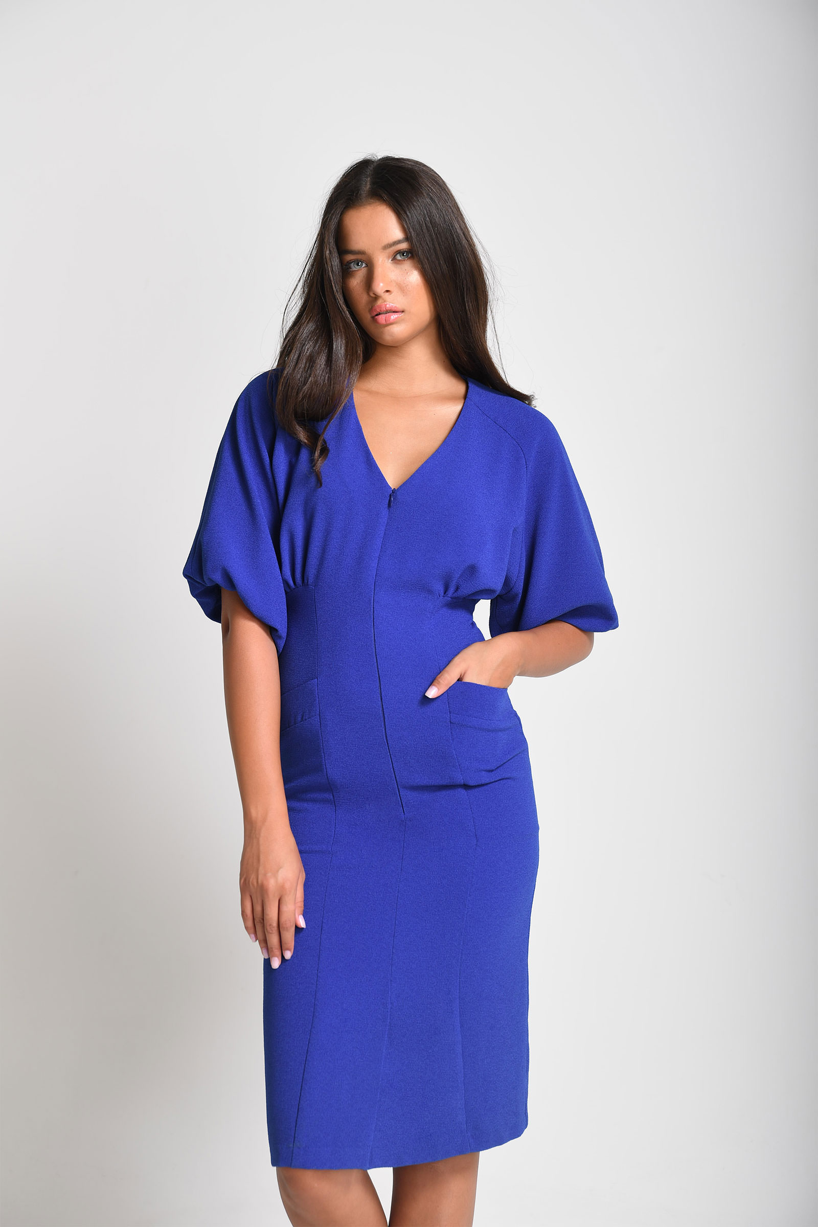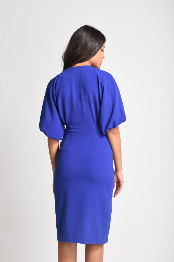 Tailored hourglass shape crepe dress with large puffy sleeves.