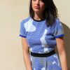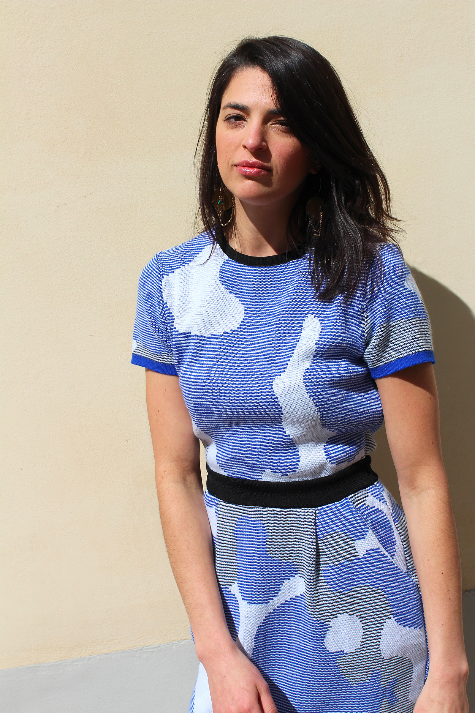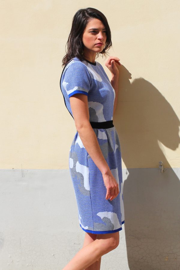 Abstract pattern constructed knit dress with black trimmings and belt insert. The dress has two pockets and a circle shaped opening on the back.Â