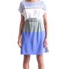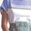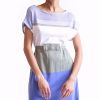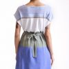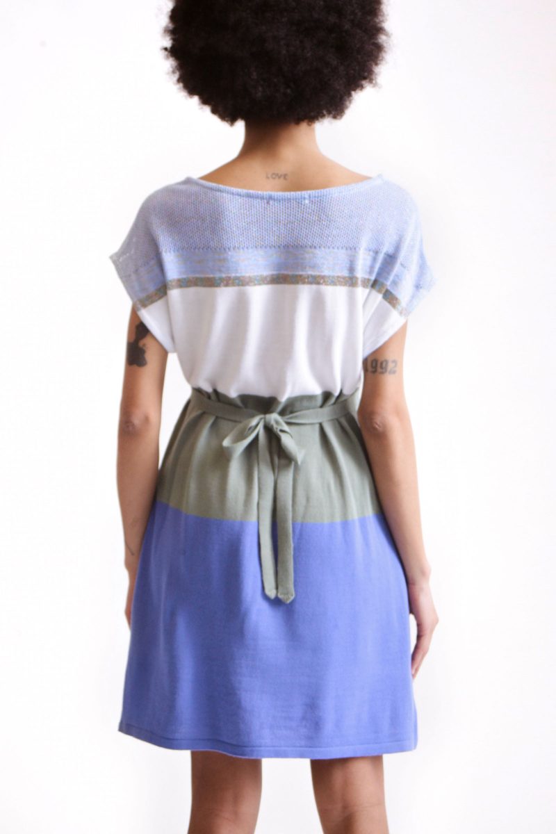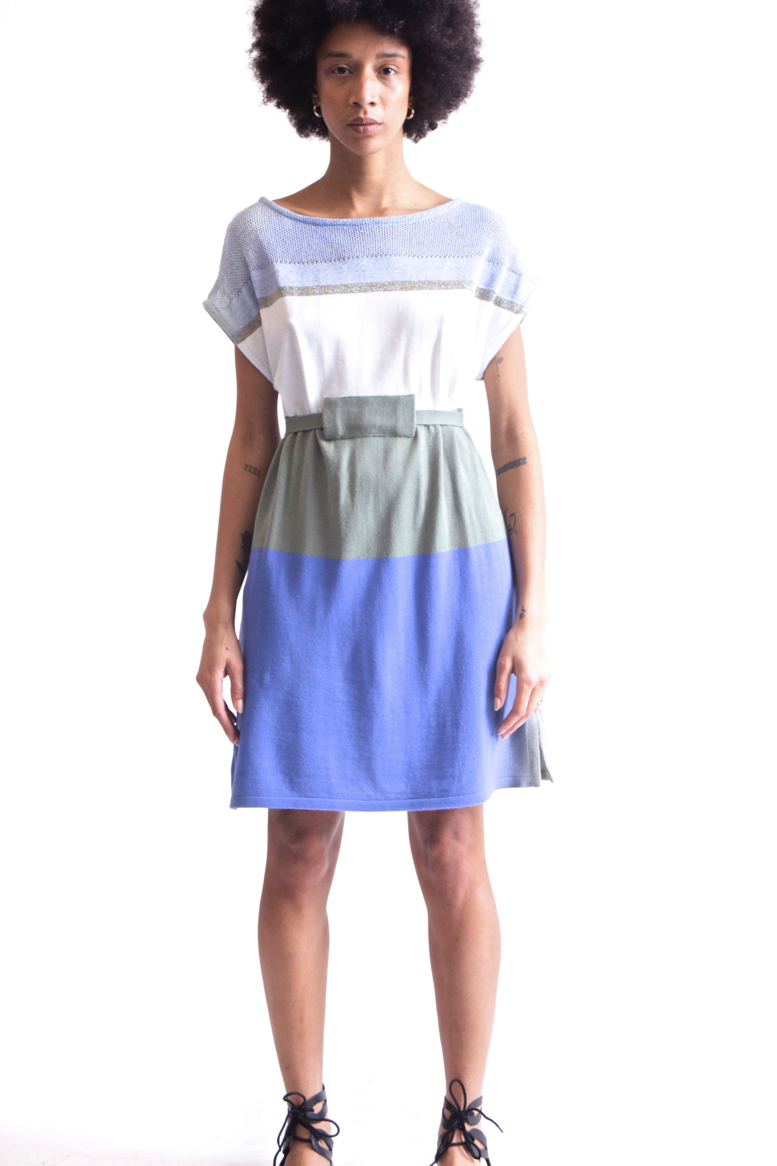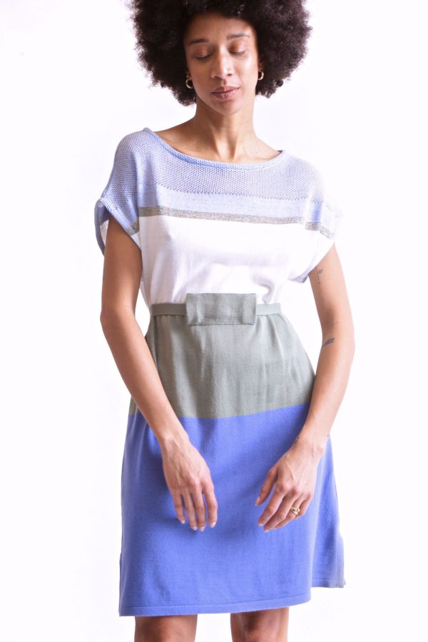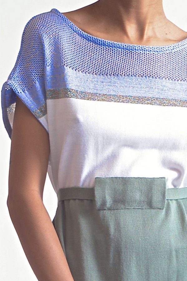 Short knit dress in large stripes. The neckline is in mesh knit with lurex details and the rest of the stripes are in flat knit. The dress has an incorporated belt out of the same knit.