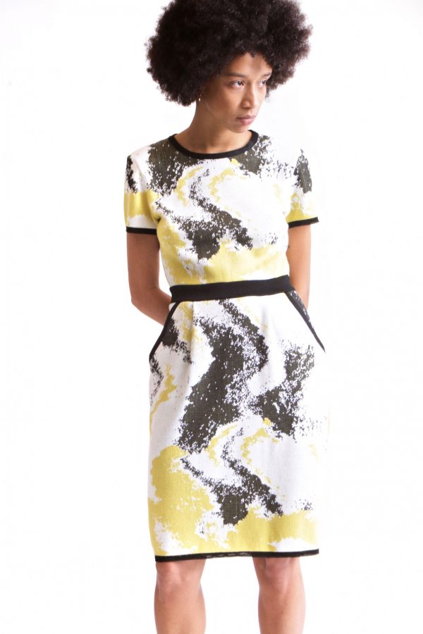 Knitted marble pattern fitted dress with pockets and a circle shaped opening on the back. The colour combo is a mix of lemon yellow, white and black.