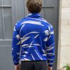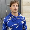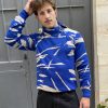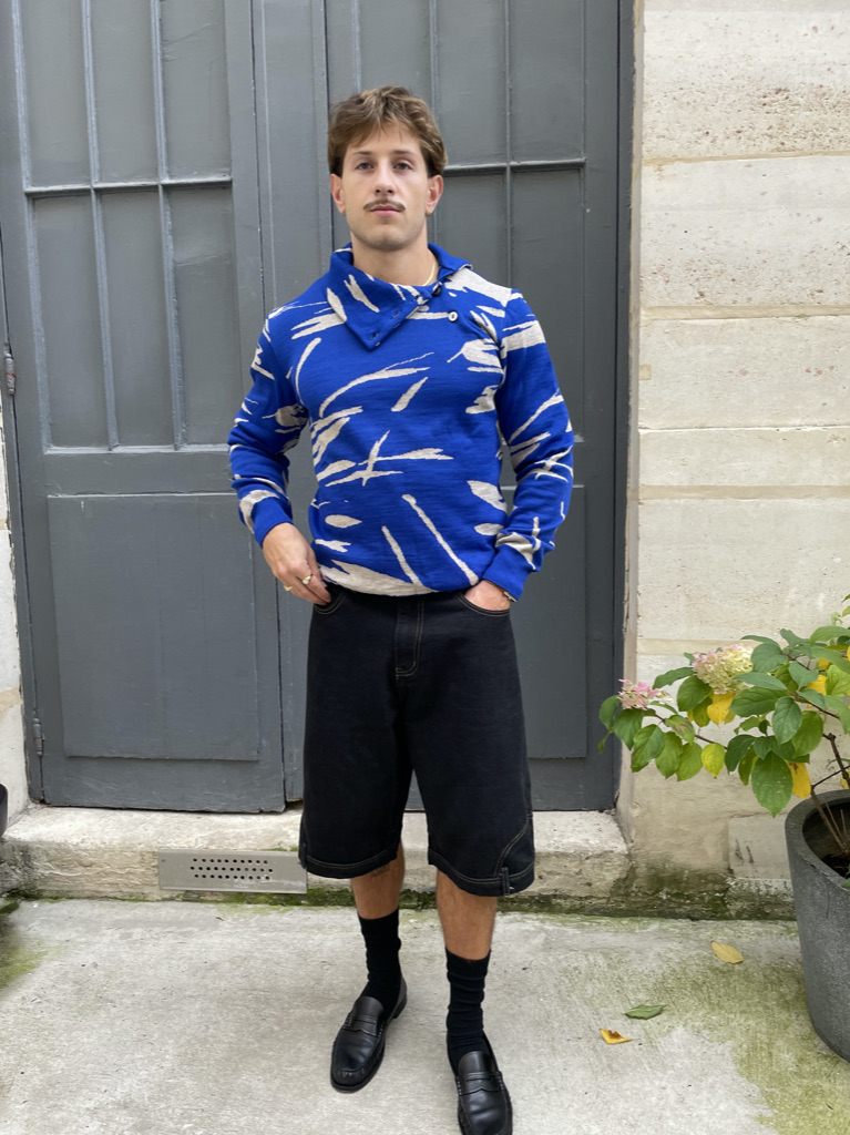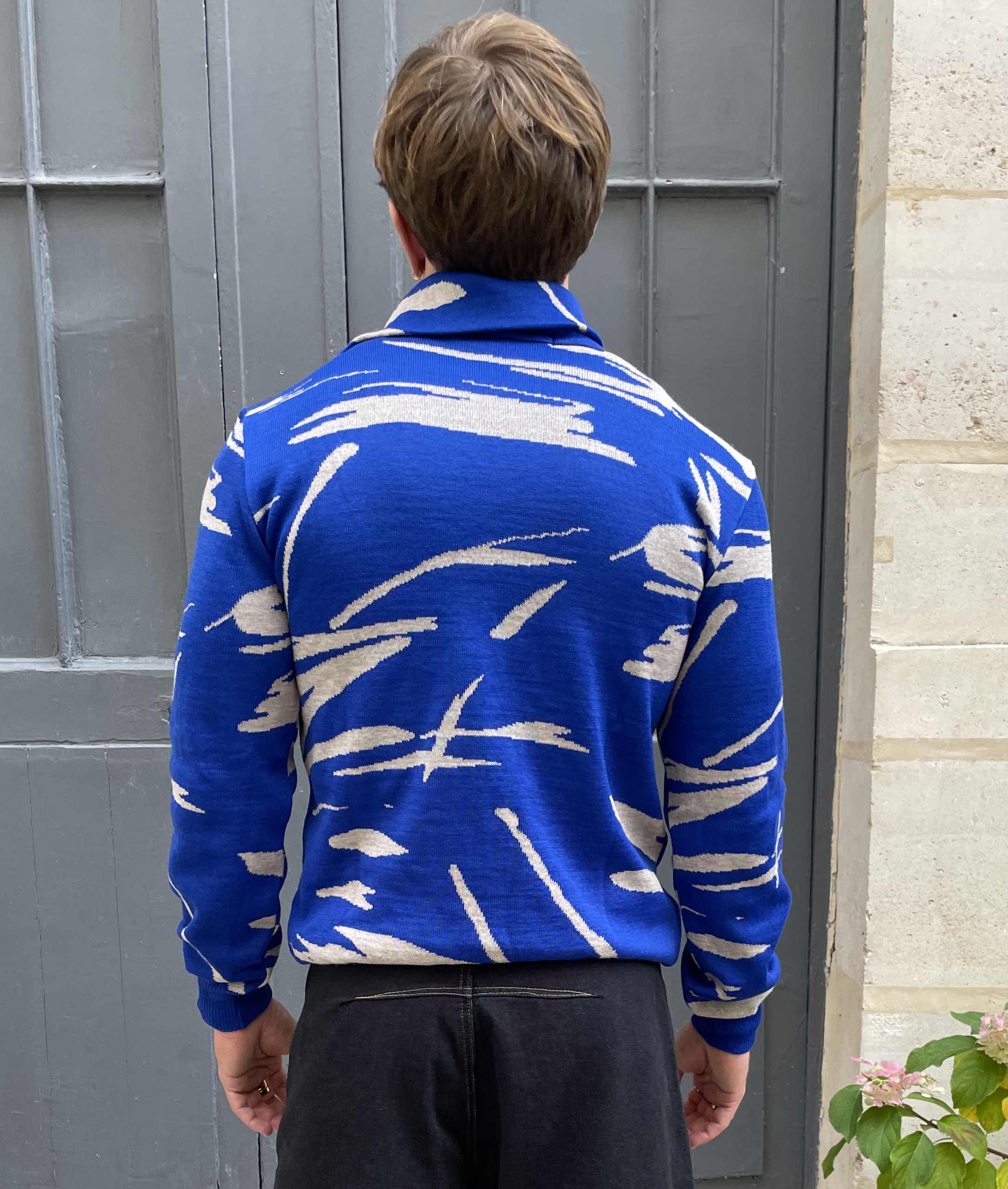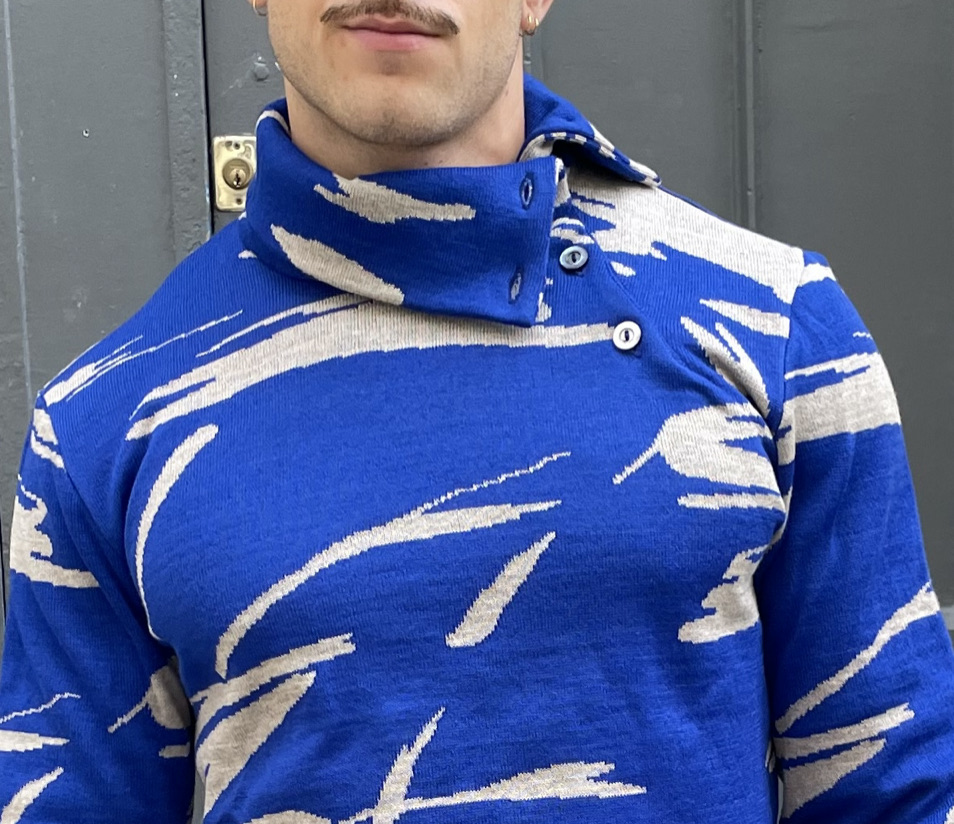 A turtleneck jacquard sweater featuring a dynamic paintbrush pattern, woven in soft textured yarns that evoke the spontaneity of an artist’s stroke. The turtleneck includes a diagonal buttoned opening, allowing one side of the collar to fall open — a small gesture that transforms structure into ease.