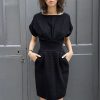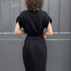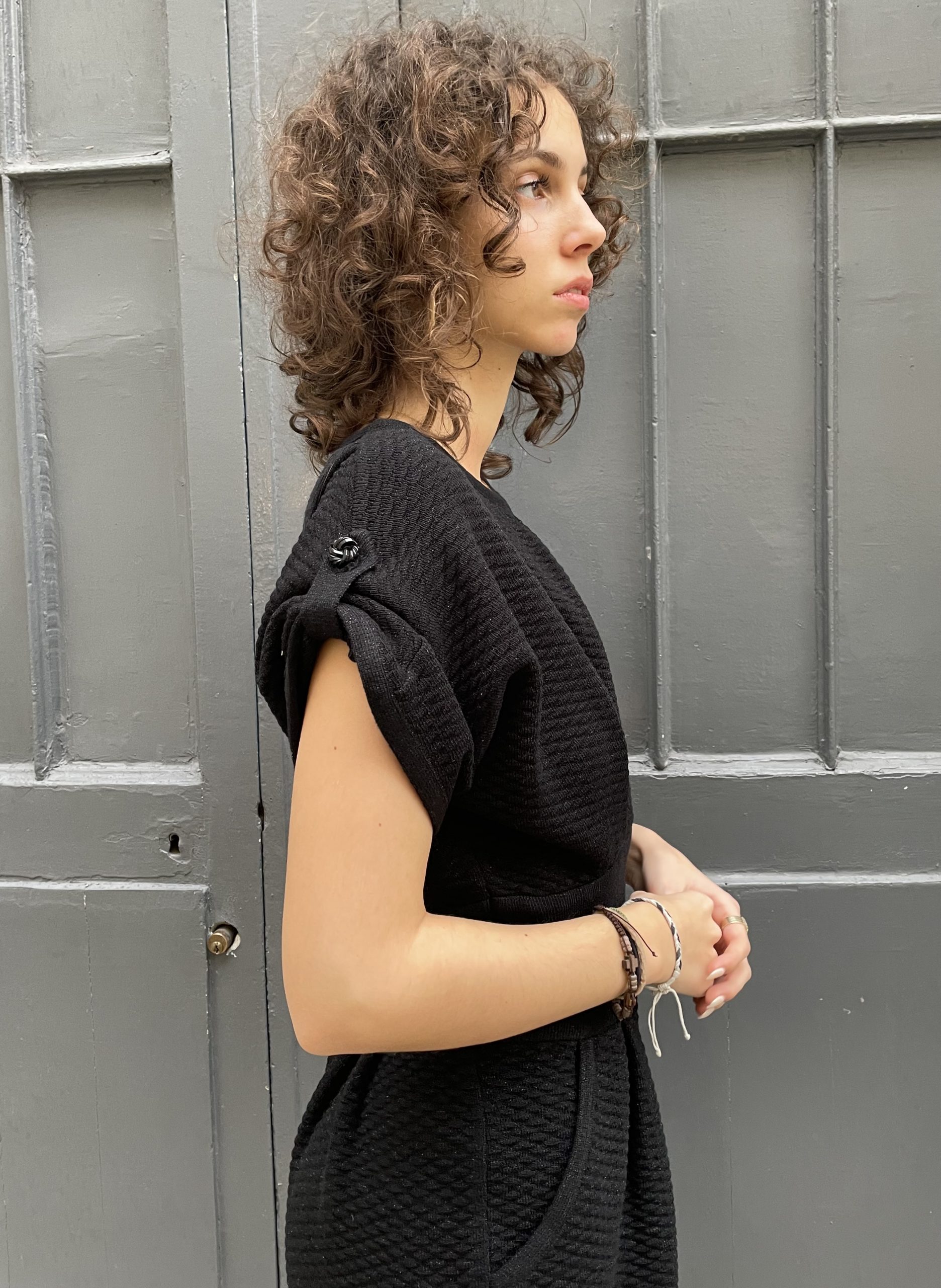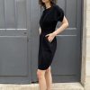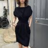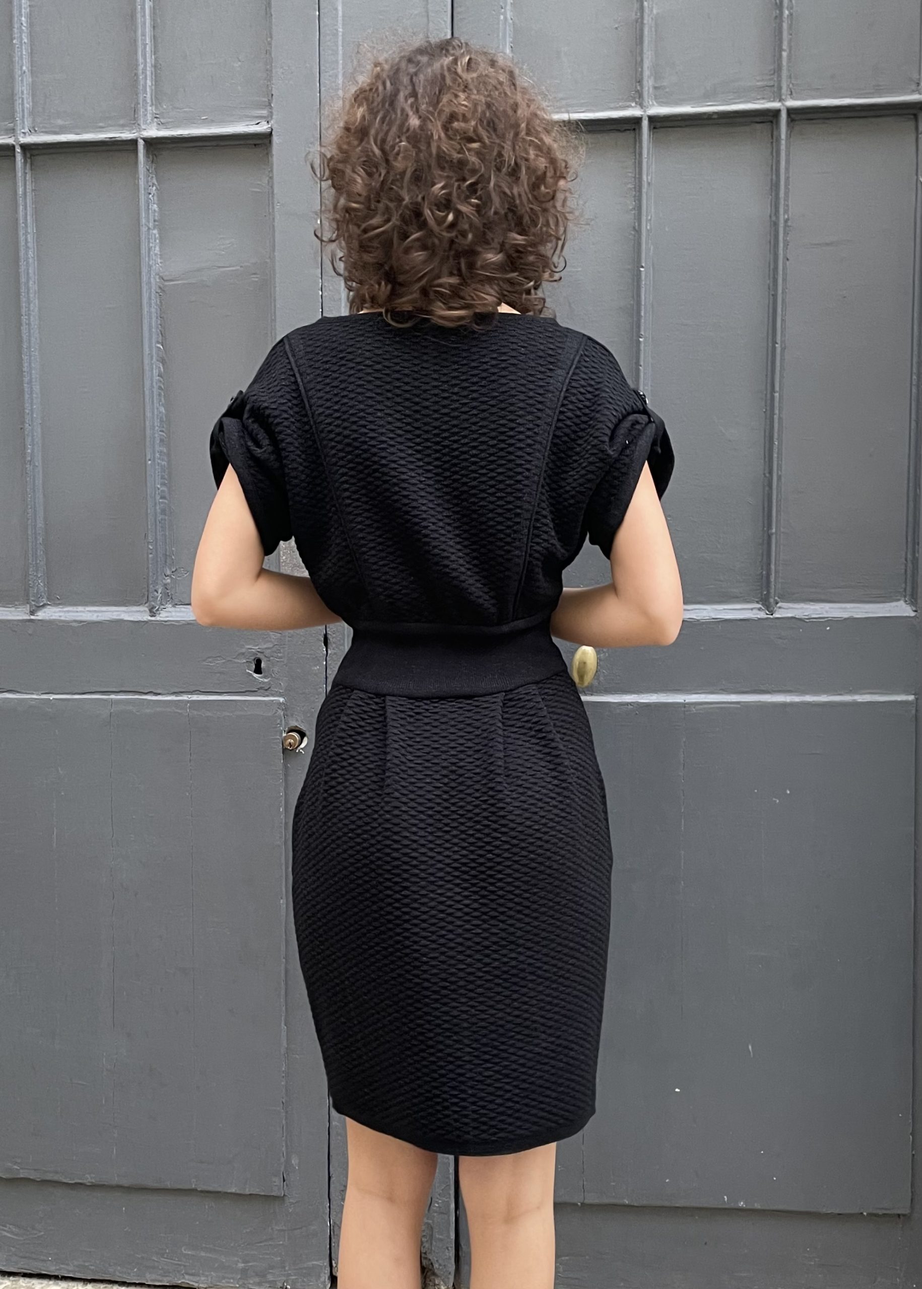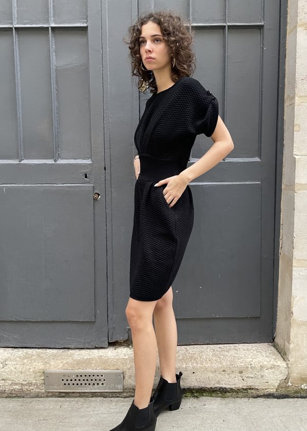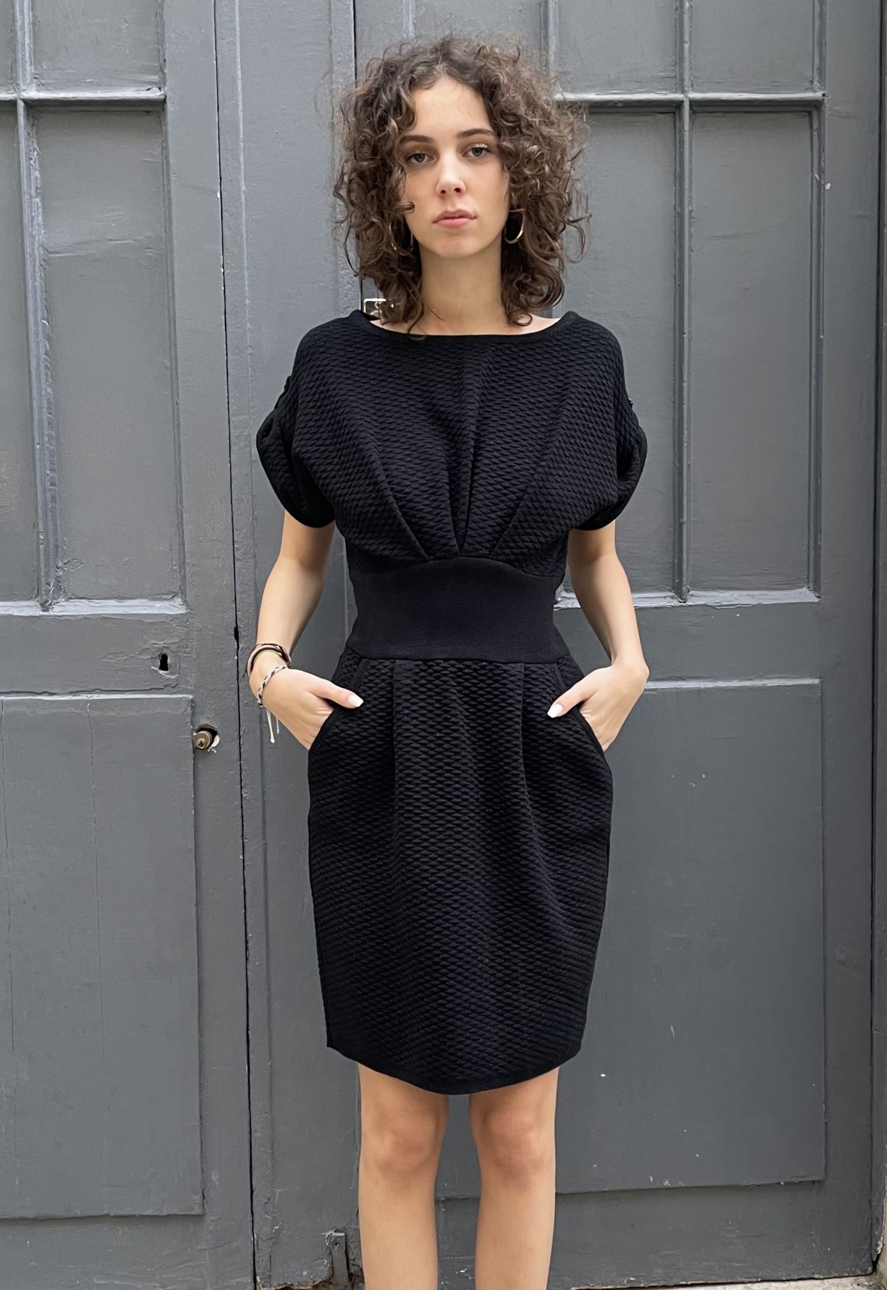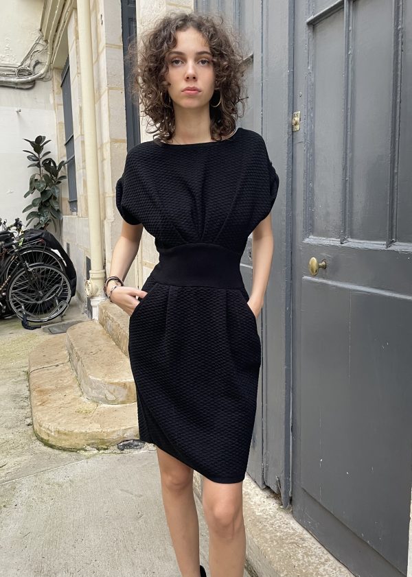 Texture knitted dress with Lurex details, This shape constructs the silhouette with a large ribbed belt. It has a pleated top with a large round neck which closes with a tear drop closing and a small glass button. The skirt is constructed with pleats and pockets. Glass buttons hold up the bat sleeves.