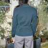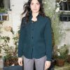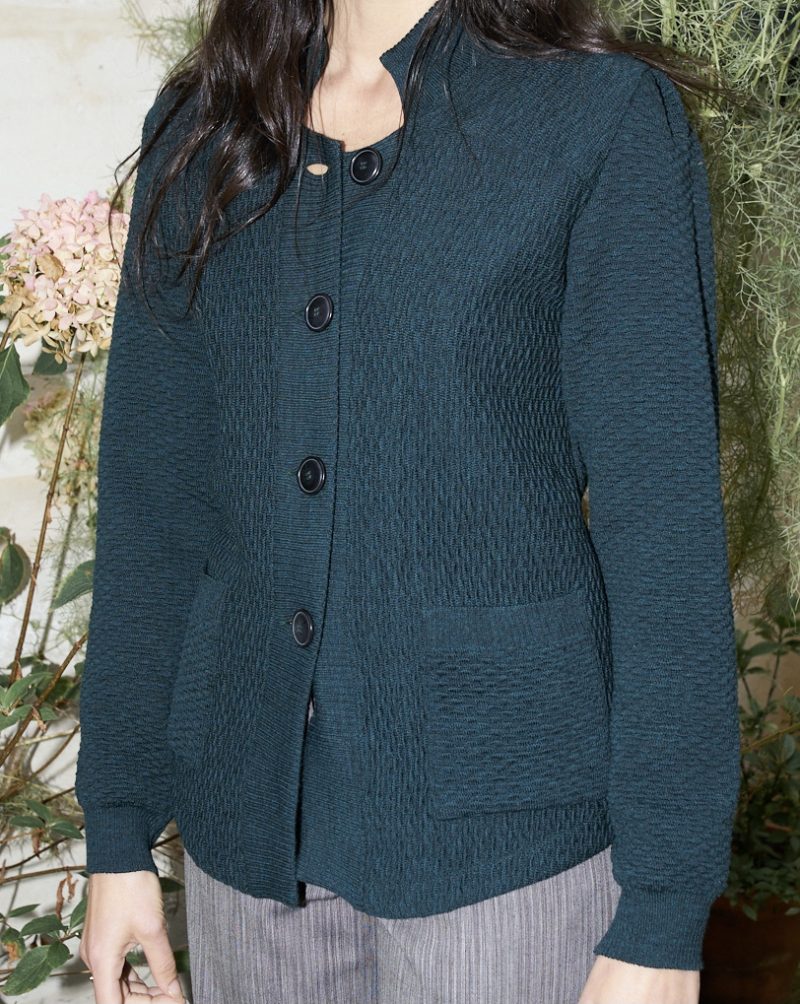 Tailored texture knit blazer with pockets and Lurex details. The back is cinched with a knitted band.