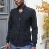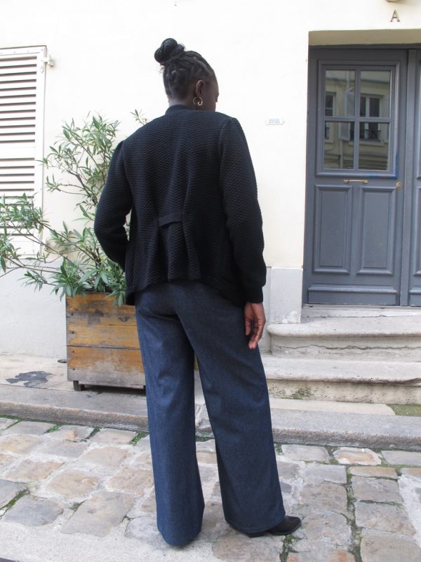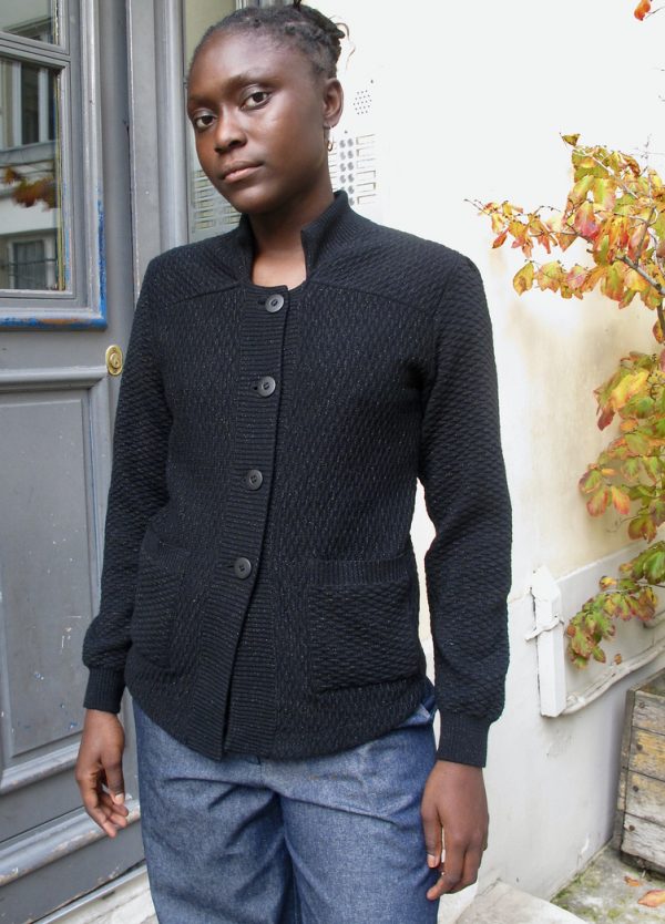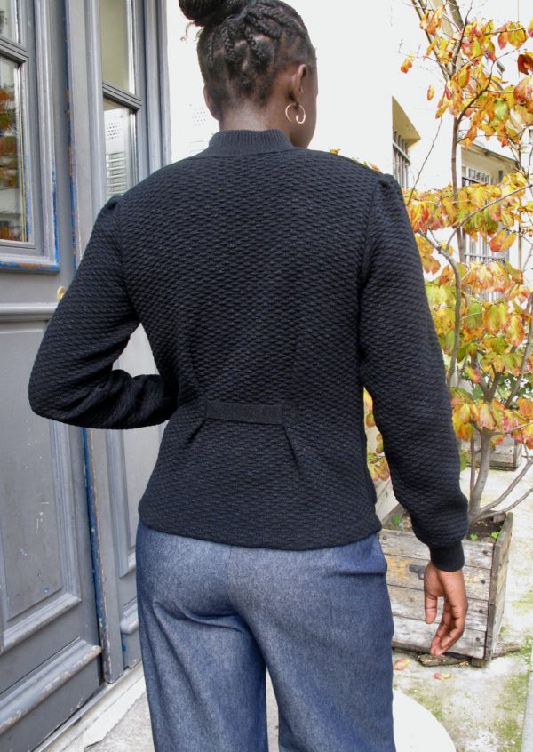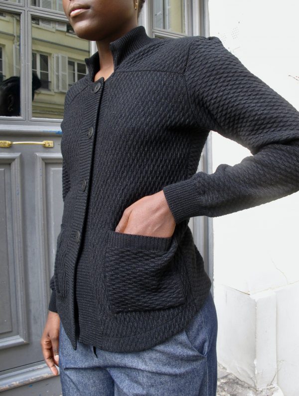 Tailored texture knit blazer with pockets and Lurex details. The back is cinched with a knitted band.