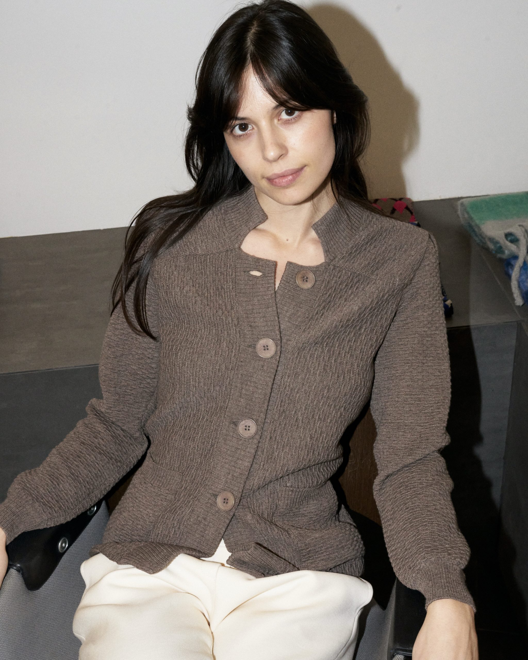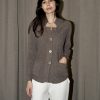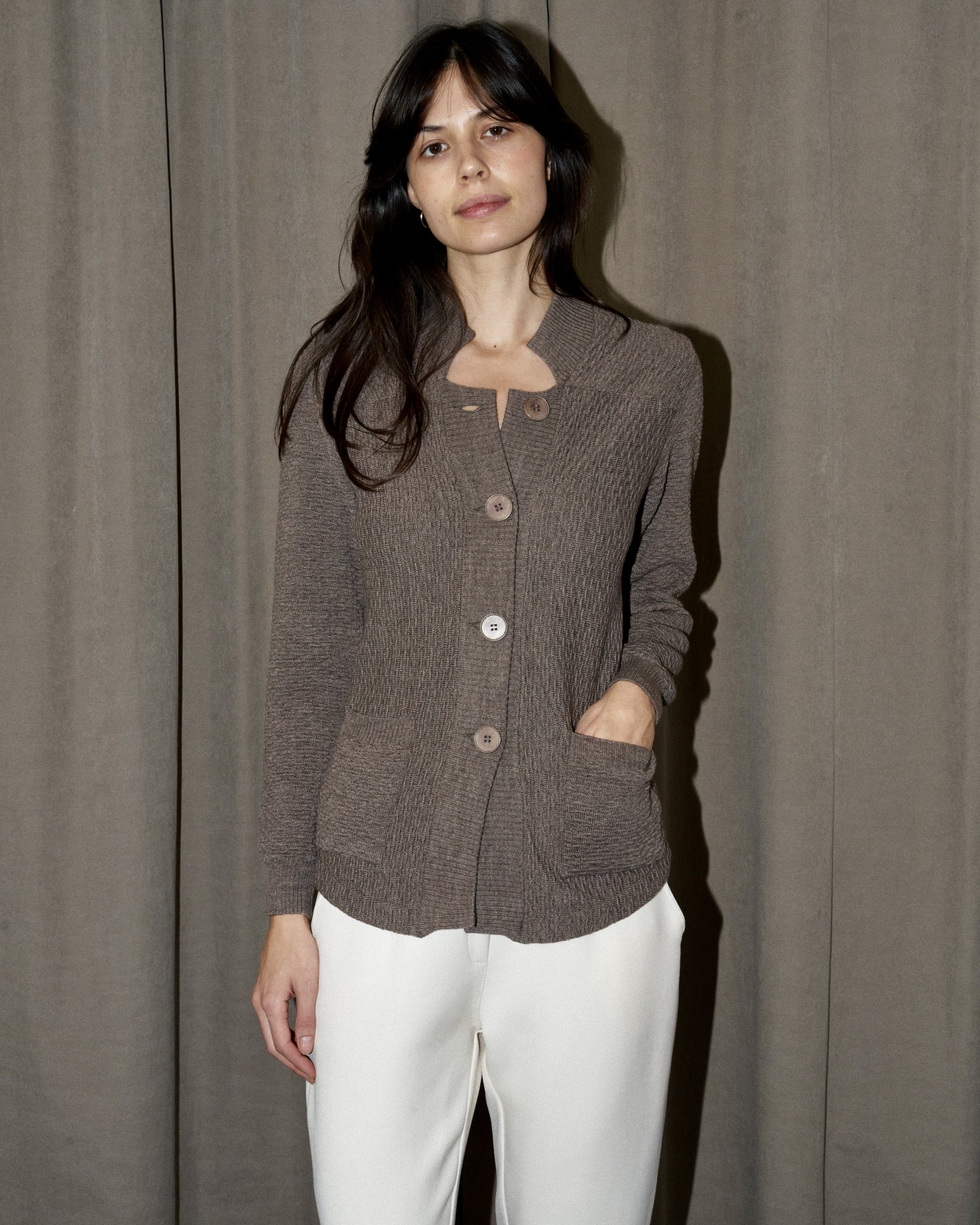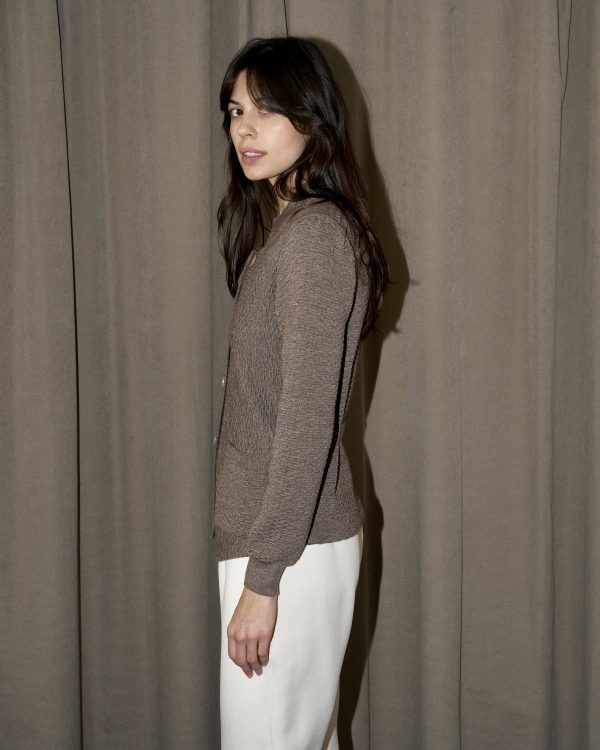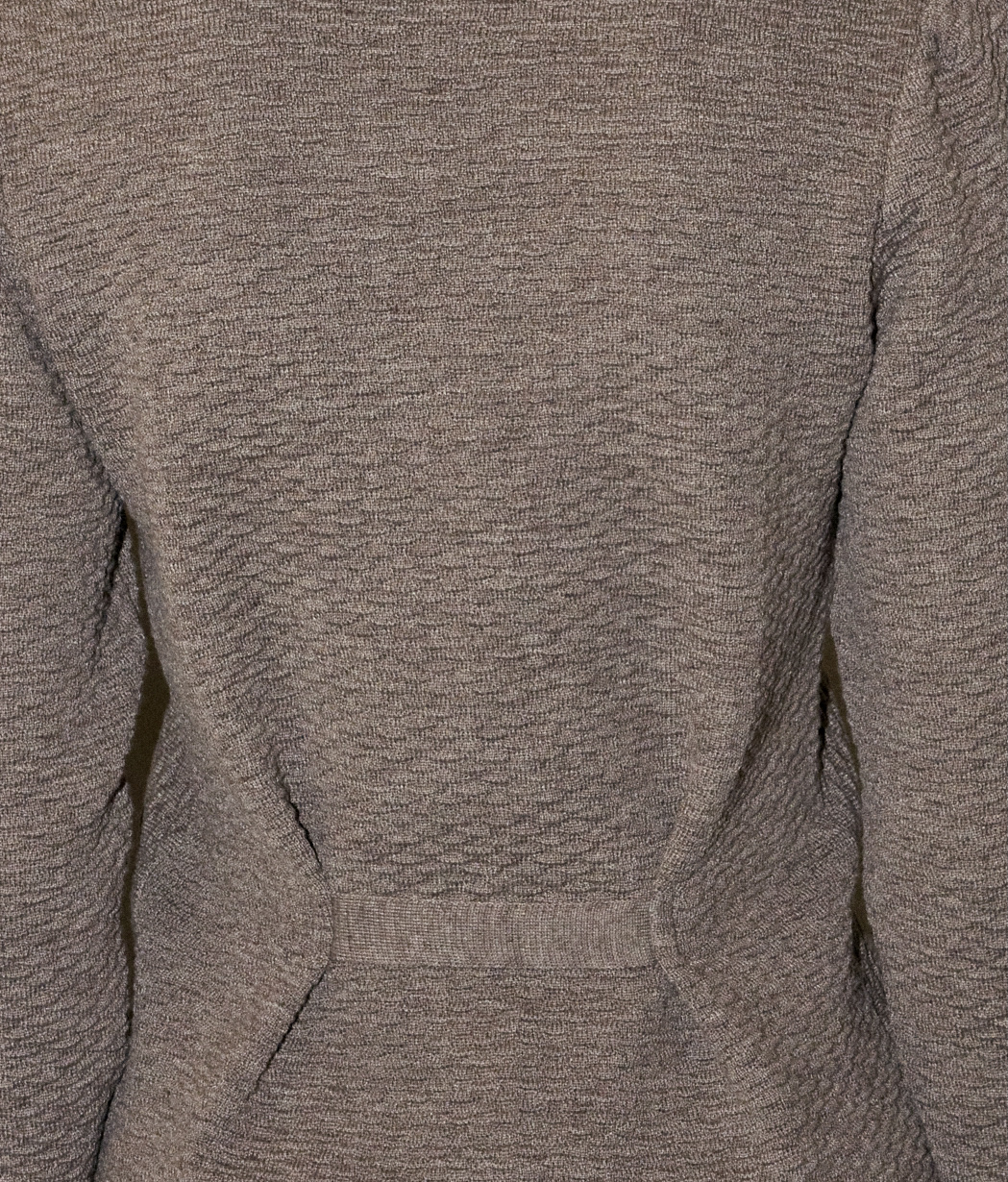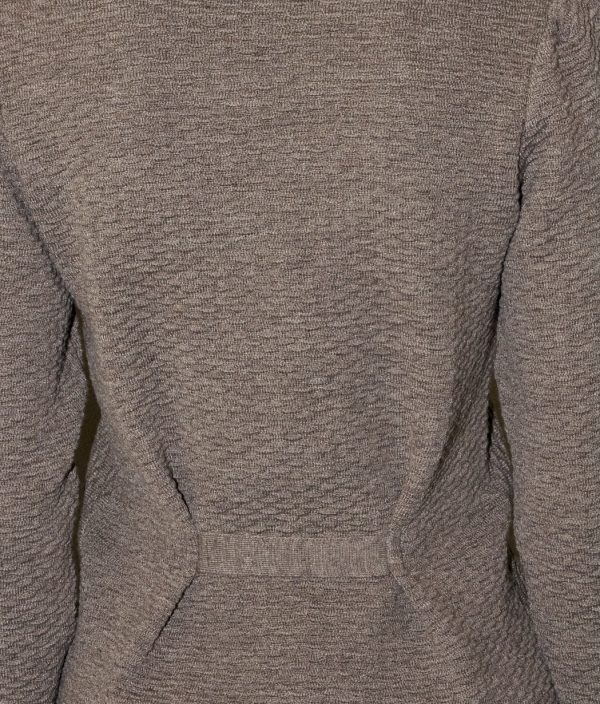 Tailored texture knitted blazer with pockets. The back is cinched with a knitted band.