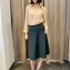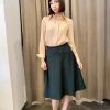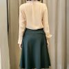 This skirt takes the timeless half-circle silhouette and enhances it with a bias-cut insert, adding natural swing and fluidity to every movement. The result is a feminine, dynamic shape that drapes with effortless elegance. At the front, the skirt features two discreet pockets, integrated cleanly into the cut for practicality without disturbing the flow. The waist is finished with a grosgrain waistband, adding a refined, tactile detail that cinches the silhouette and gives a couture touch.