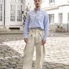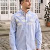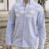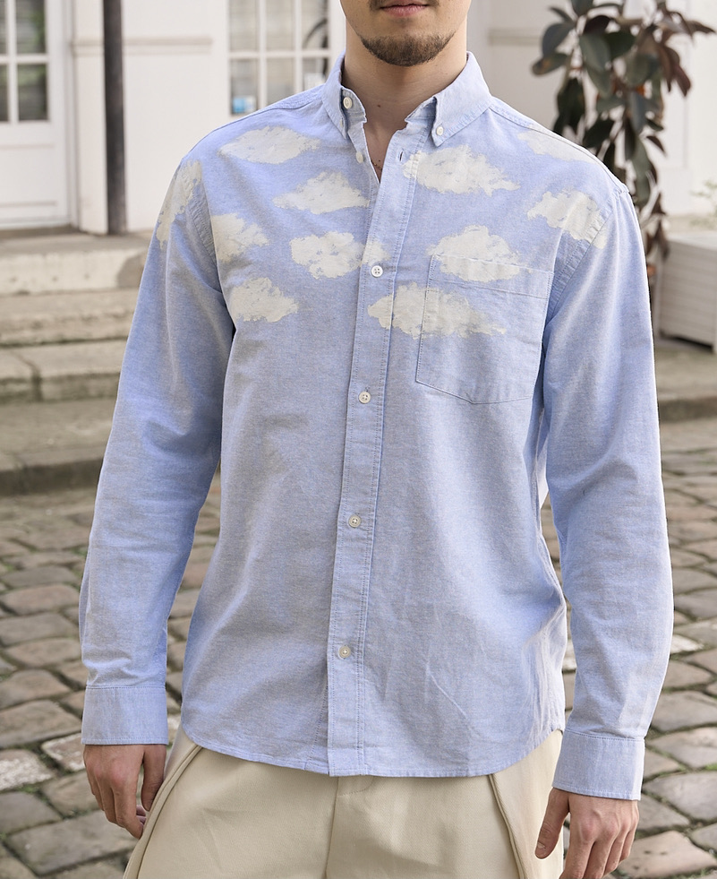 Relaxed fit Oxford light blue shirt with hand printed white clouds,