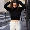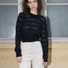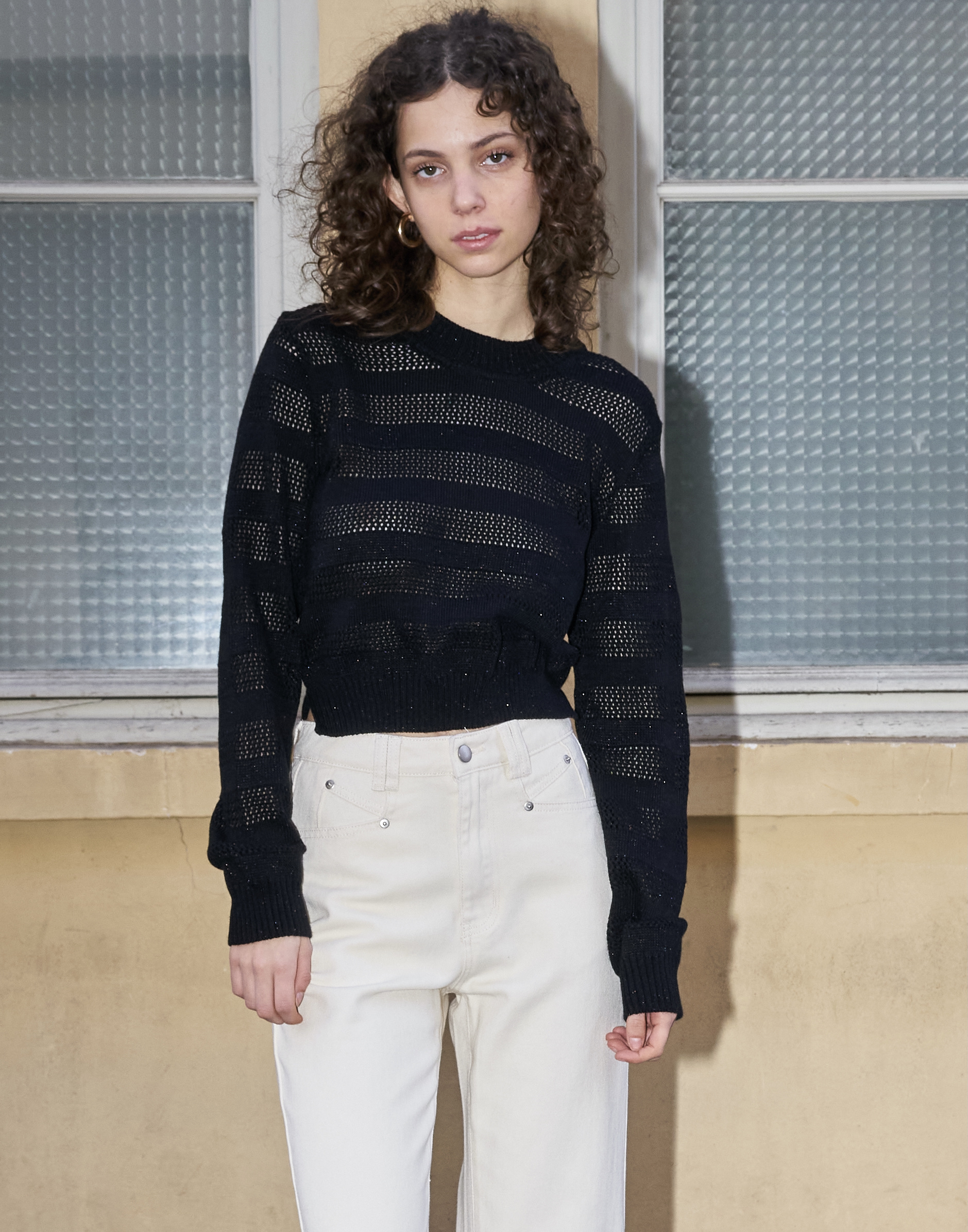 Gemima cropped round neck sweater in mesh and jersey stripe knit. It has a slim fit shape and stilted rib finishings on both sides.