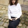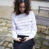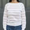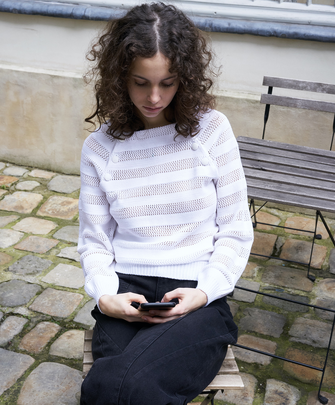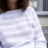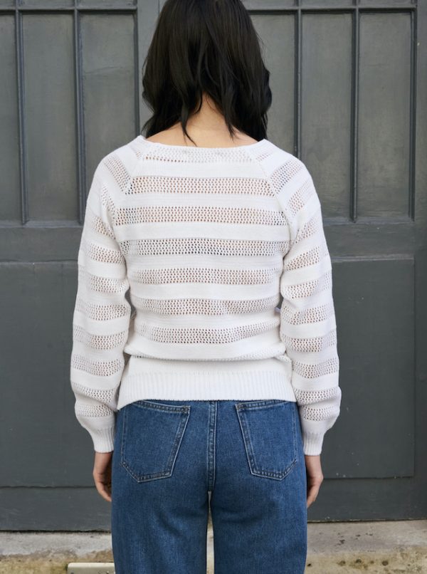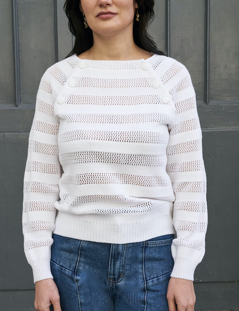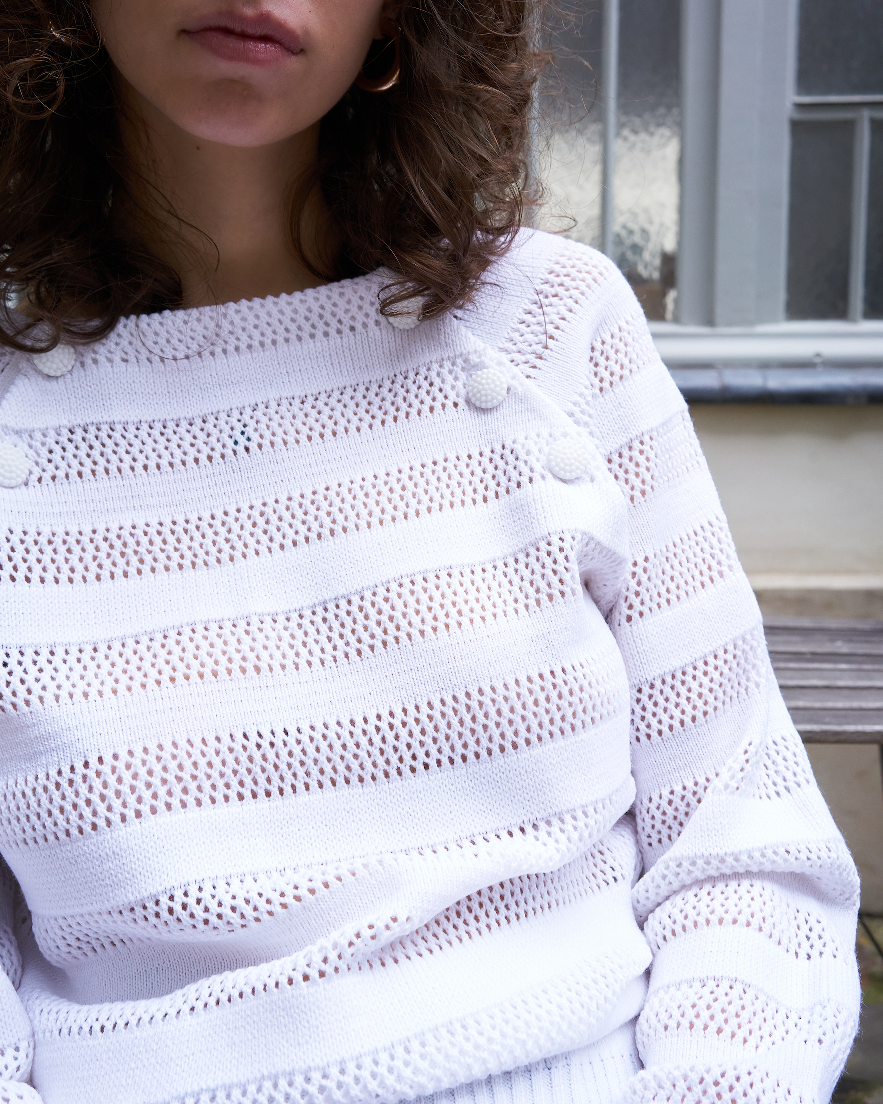 Delia soft boat neck sweater in mesh and jersey stripe knit. It has two diagonal nautical style openings on each side of the neckline which are decorated with hand made glass buttons.