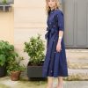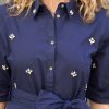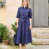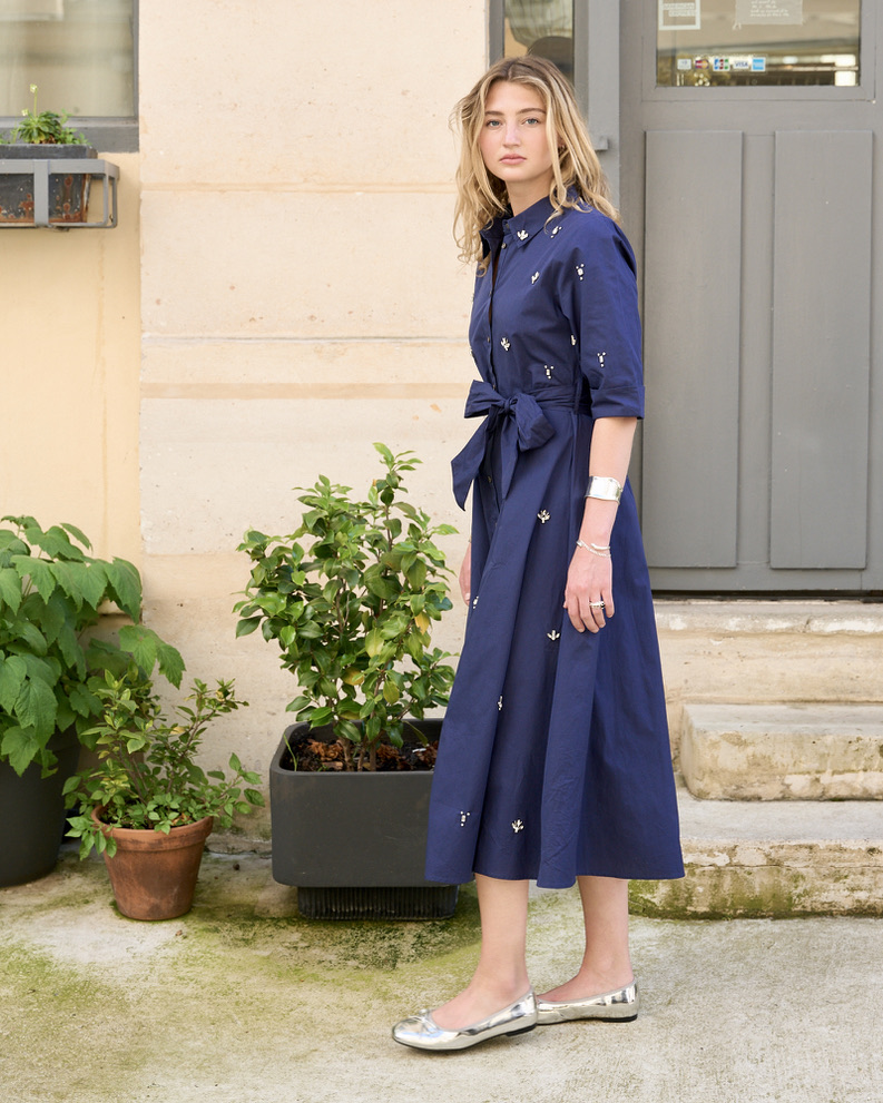 Midi length cotton poplin shirt dress embroidered with crystals, it has pockets and elbow length sleeves with double turn-up detail. The large belt is made from the same fabric.