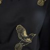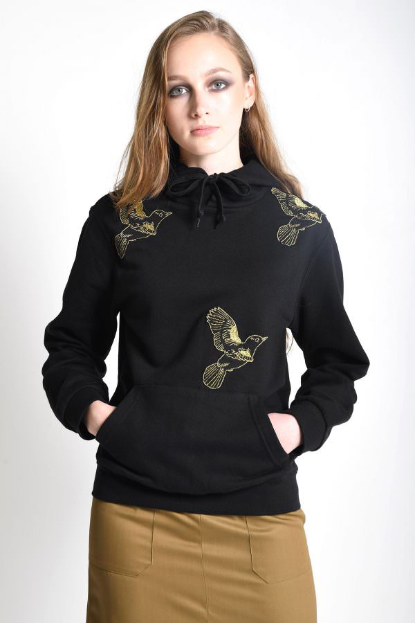 Black Hoodie with front pockets and applique birds embroidered in metallic gold thread. The style is gender fluid with relaxed fit.