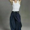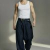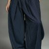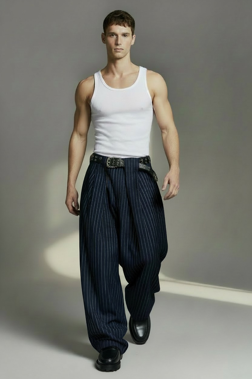 Wide-leg navy trousers with fine white pinstripes, cut with deep front pleats that subtly integrate the belt loops into the construction. A discreet elasticated panel at the back offers comfort and adaptability while preserving a sharp tailored line.